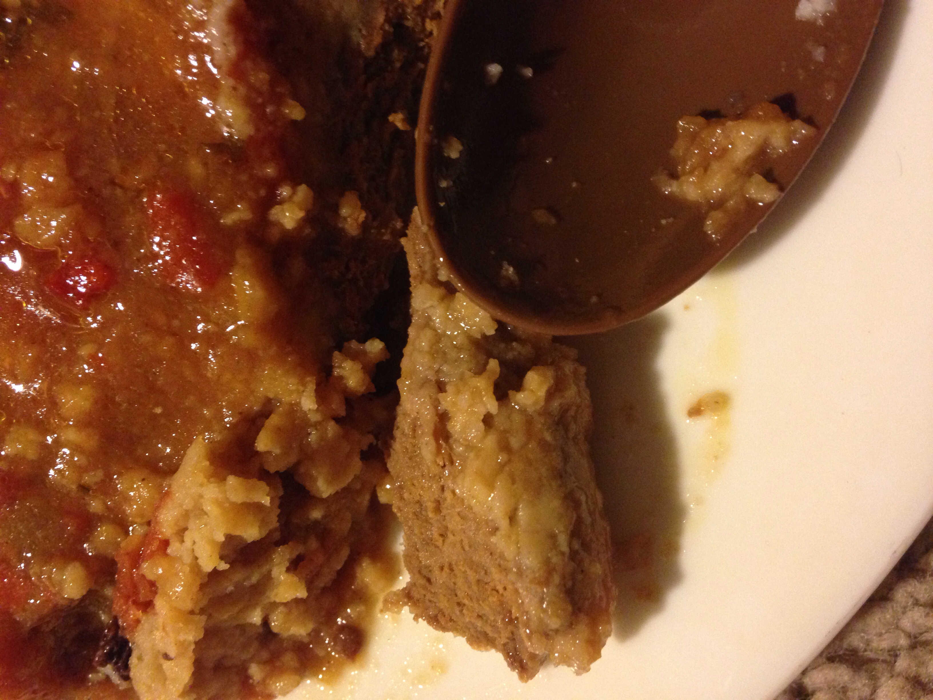 This was probably the weirdest part of the chicken... It had turned into this dark brown color as seen in the picture, you could tell it was separated and reformed, obviously... Judging by the consistent texture and color. But still weird! And now for the taste test... Ew! This was an immediate spit out, absolutely disgusting. It tasted just as it smelled, horribly seasoned with a hint of plywood. The cutlet held up all of these years but was definitely a NO GO on it's initial maiden voyage into my mouth and back onto my plate!!