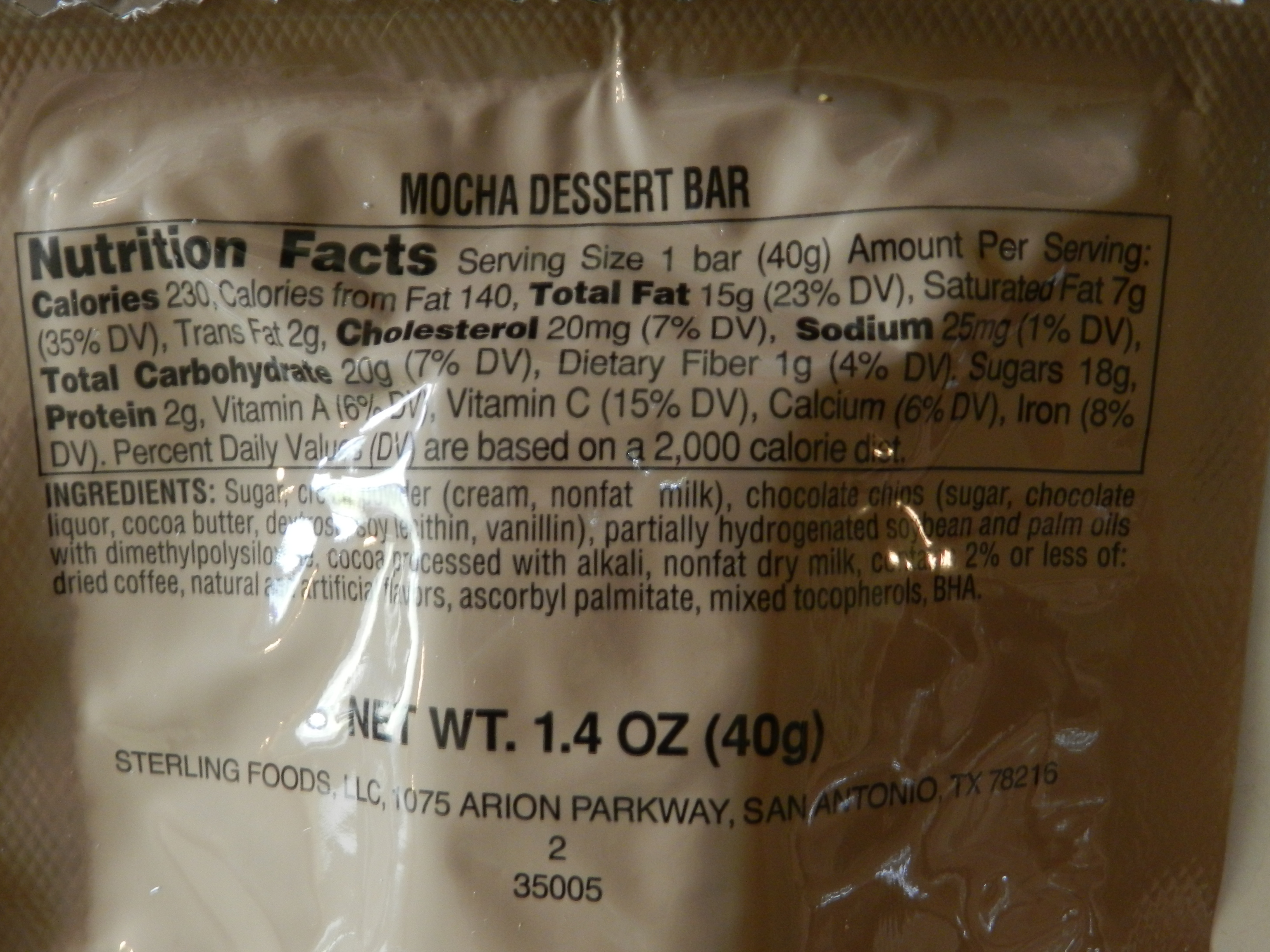 Both were amazing. I ate them both at the same time which was rather decadent. The Chocolate Covered Cookie is always a coveted ration commodity & everyone loves them & are familiar of not only their sheer goodness , but also their 25+ year shelf life! The Chocolate Sports Bar is amazing, much like what Powerbars used to be like back in the 90's before they added soy protein in them. I wish I had a 100 of both.. such good Ration Snacks.