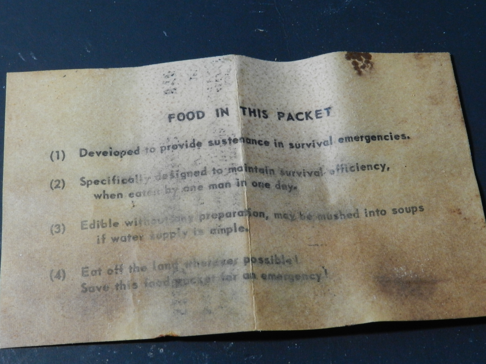 Would have to say this kit appears to be a well balanced kit given the time frame. I am sure if pilots or naval personnel had these in a real survival situation. The contents would provide good caloric intake and last a good while if used sparingly.