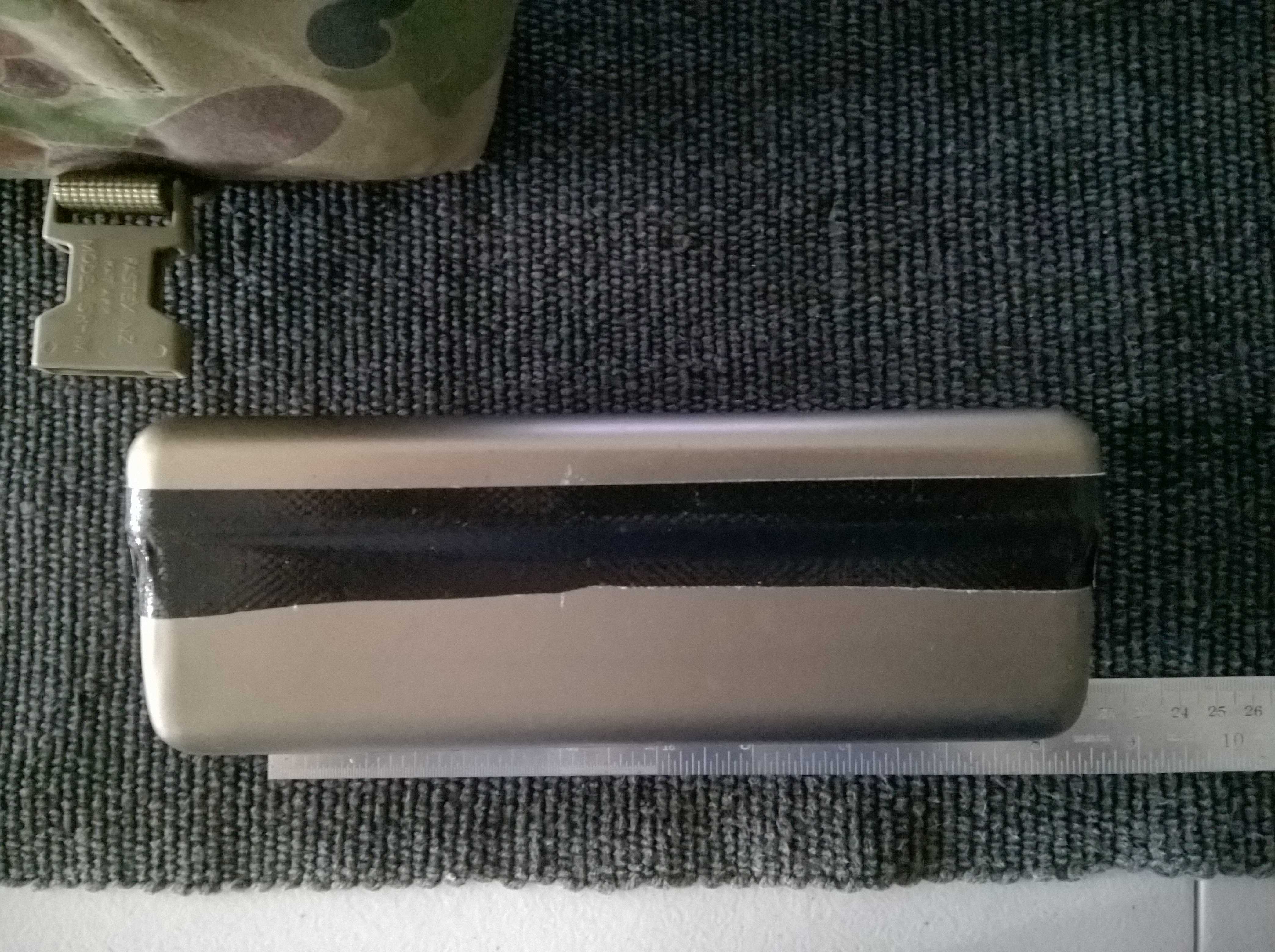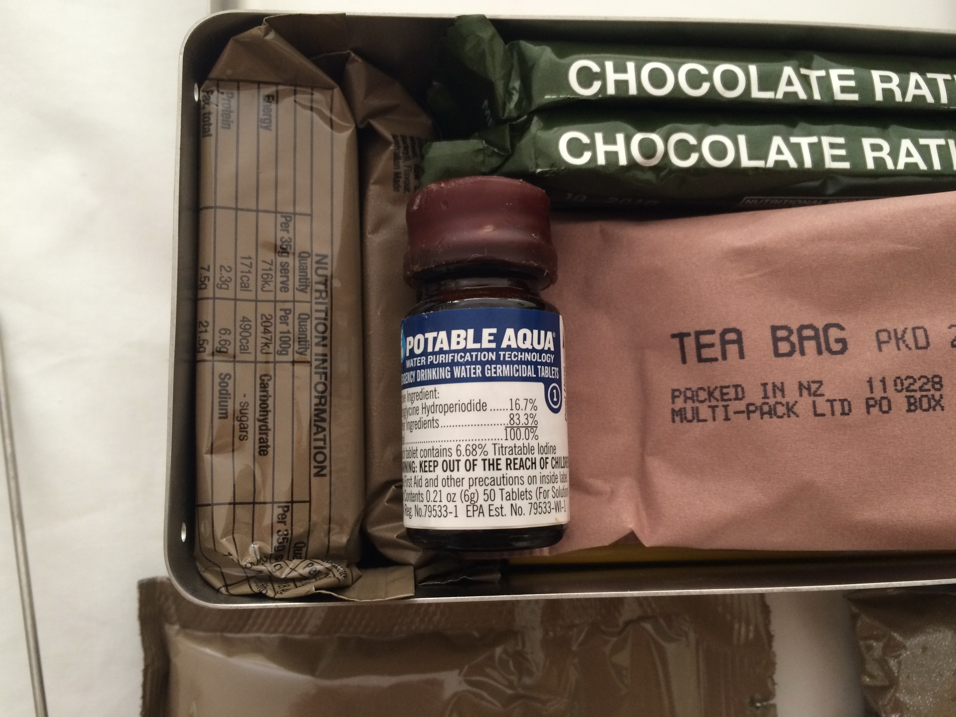 Top pamphlets is a list of contents and instructions for water purification. The two wires you see on the left are for converting the case into a canteen for boiling water. The energy drink powder had already become solid, so it appears the duct tape wasn't that great at keeping out the moisture. In there is two bars of chocolate, pack of M&M's, small muesli bar, packet of biscuits (scotch fingers), tea, coffee, sugar, milk powder, beverage powder, matches, toilet paper, scouring pad and the usual plastic bags.