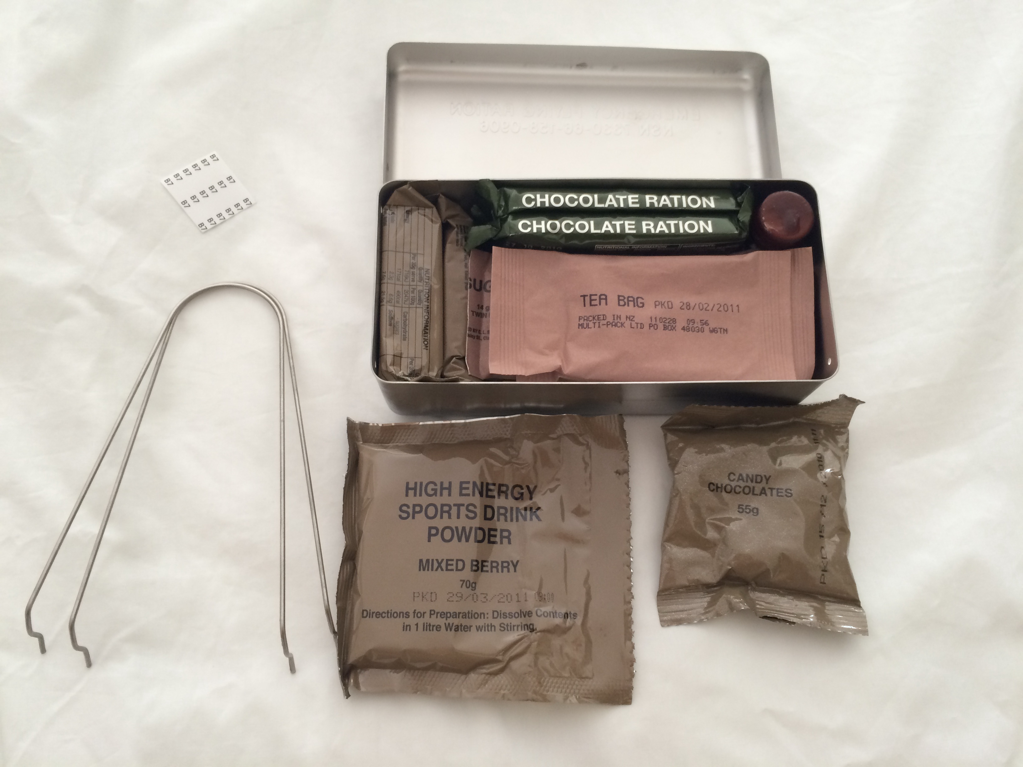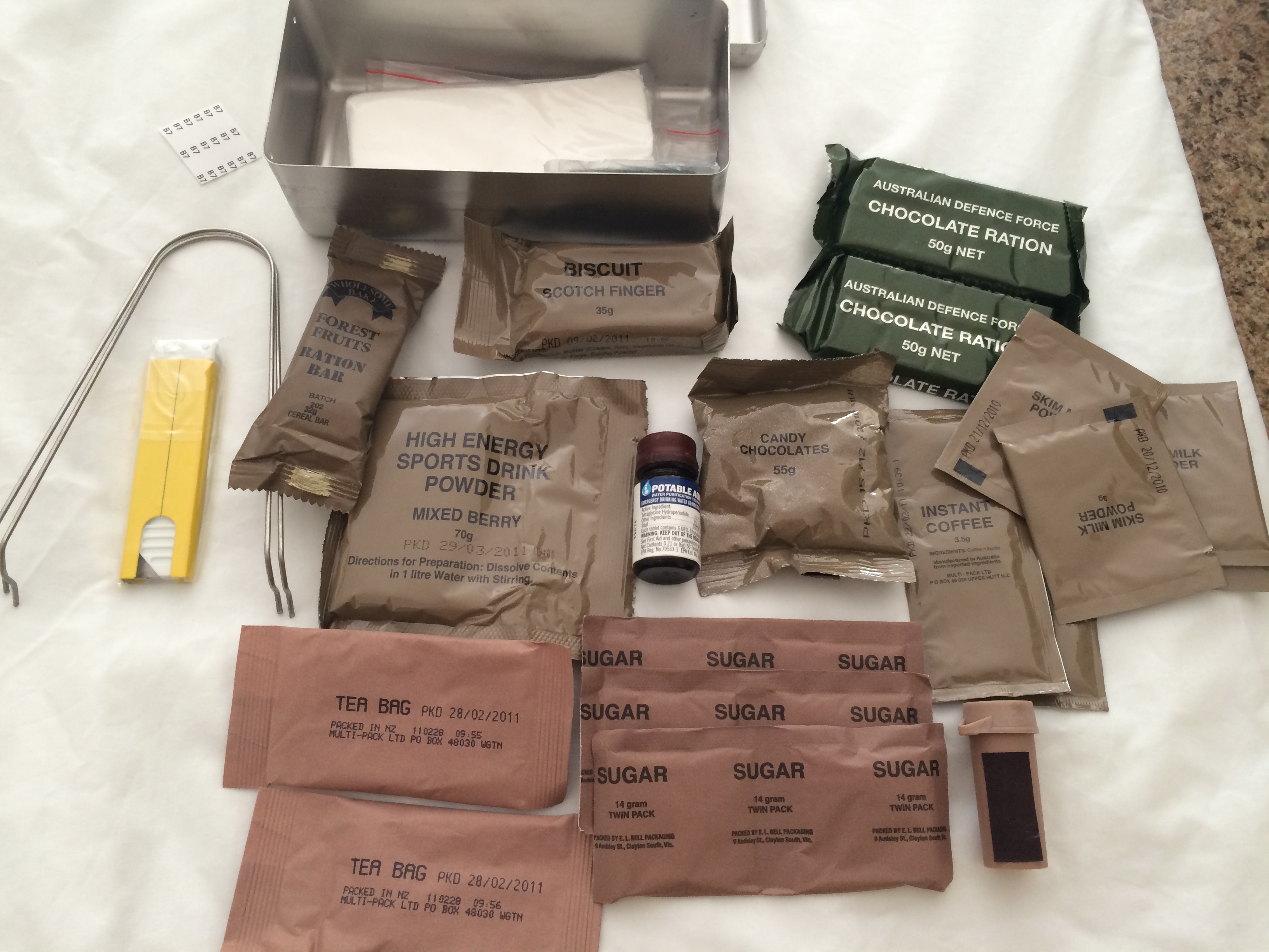 Top pamphlets is a list of contents and instructions for water purification. The two wires you see on the left are for converting the case into a canteen for boiling water. The energy drink powder had already become solid, so it appears the duct tape wasn't that great at keeping out the moisture. In there is two bars of chocolate, pack of M&M's, small muesli bar, packet of biscuits (scotch fingers), tea, coffee, sugar, milk powder, beverage powder, matches, toilet paper, scouring pad and the usual plastic bags.