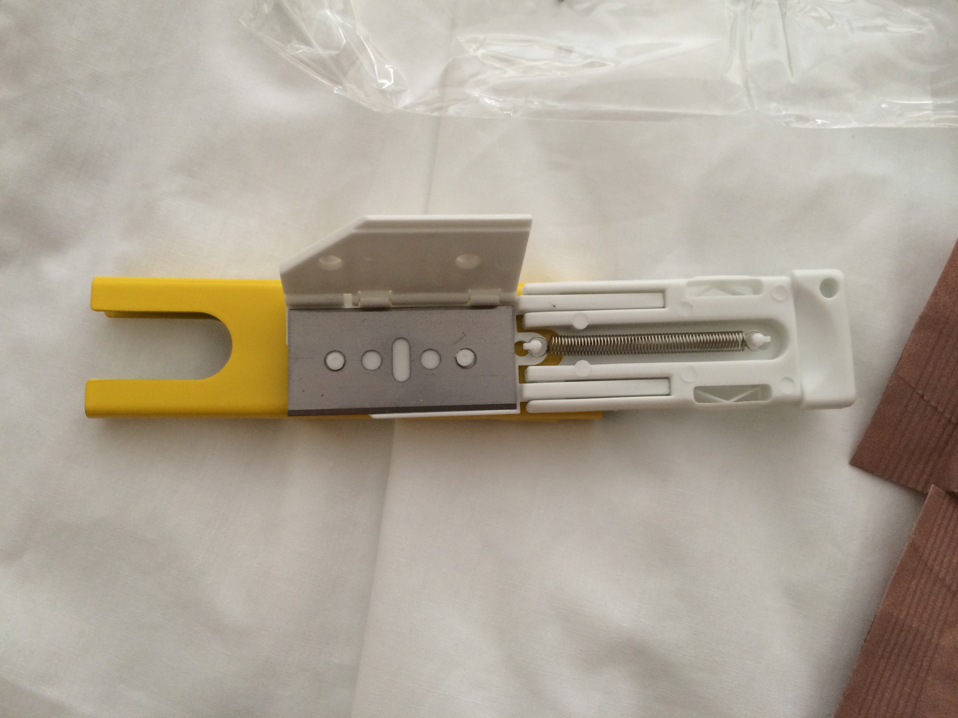 Here's everything unpacked. The yellow stick on the right is a spring loaded utility knife, which I thought was a nice touch. Only one blade in it though and it feels a bit flimsy. Light duty only I think. You won't be sawing through logs with this