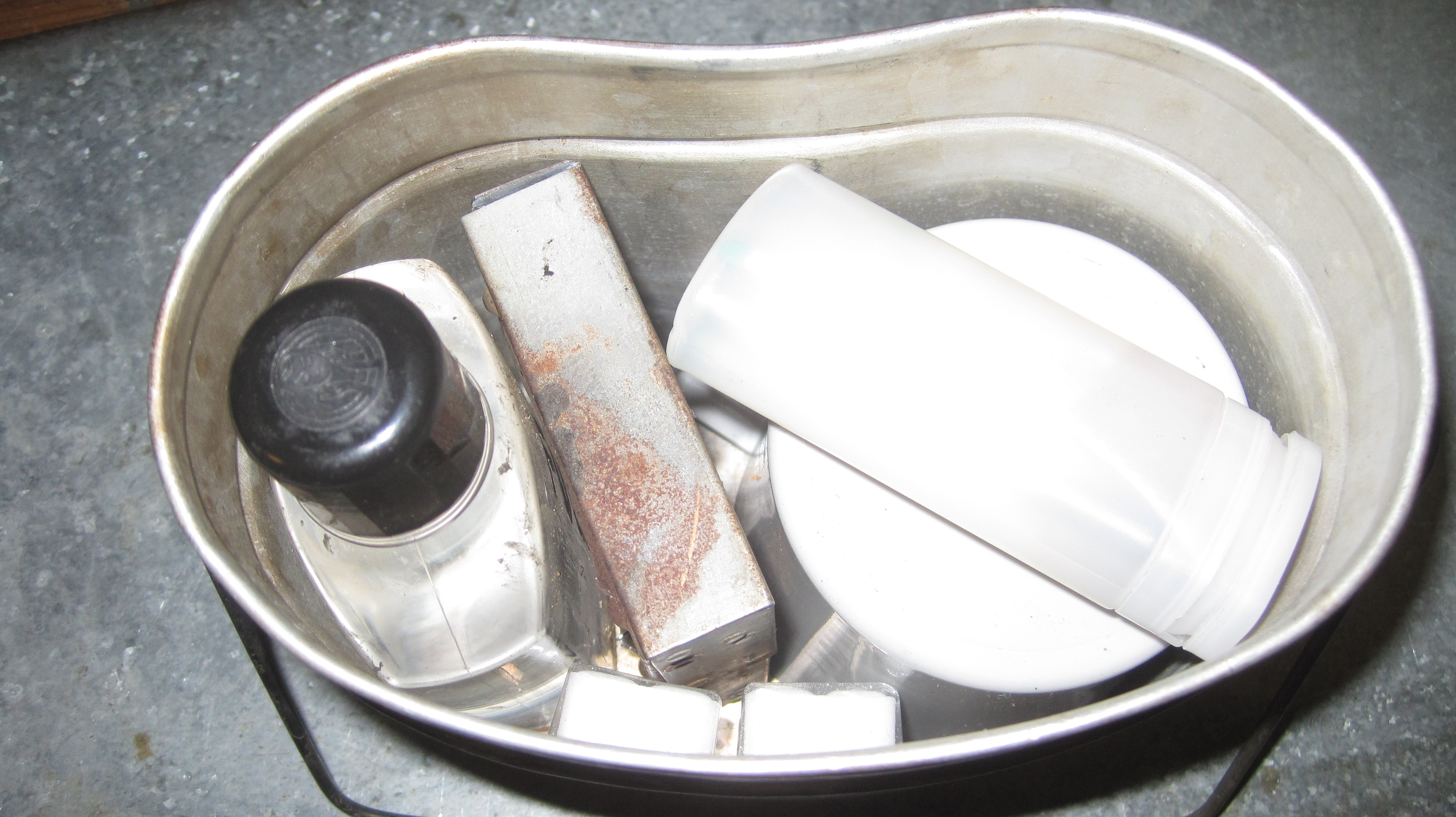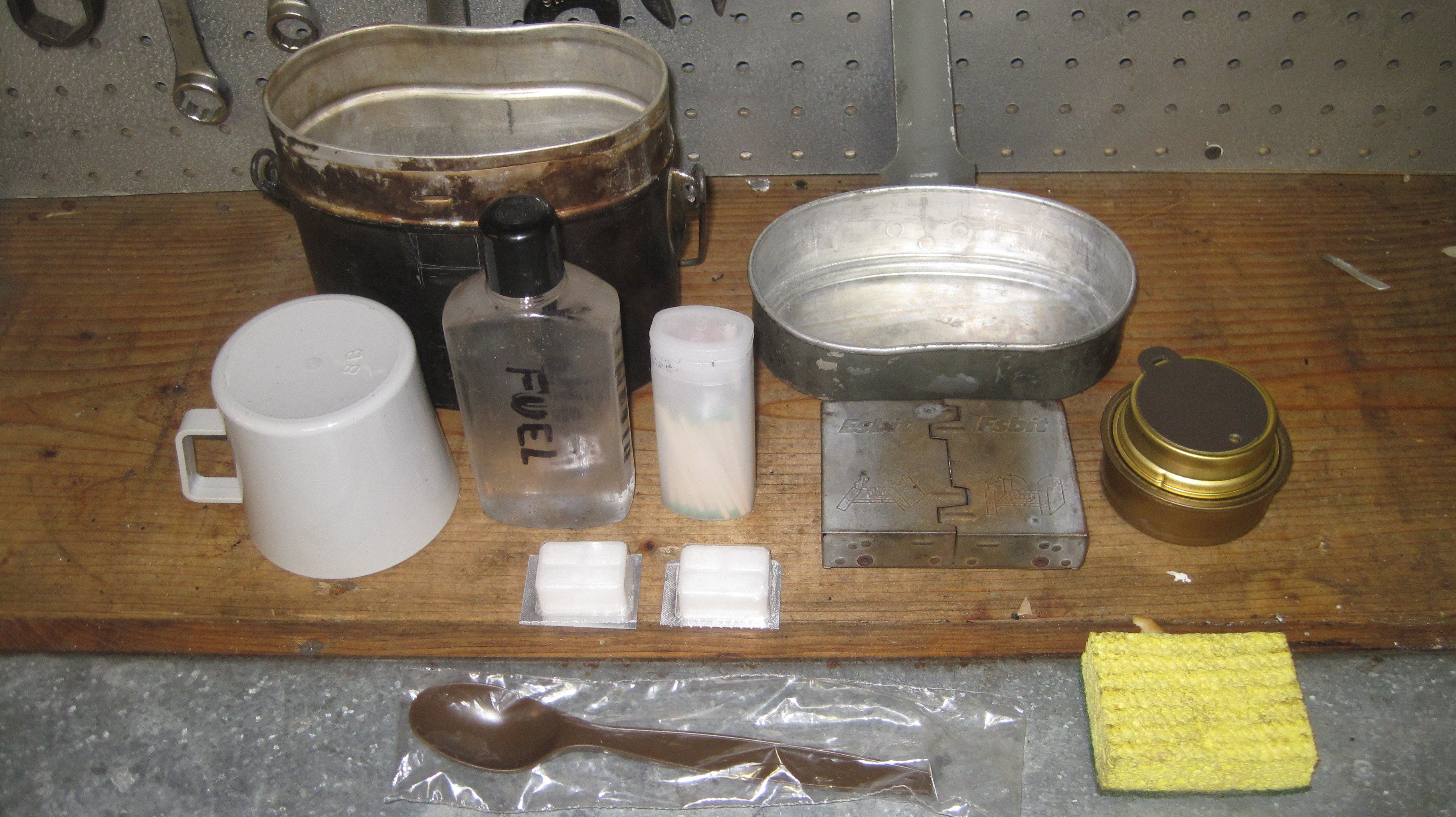 This contains the Trangia, Esbit, coffee cup ,spoon fuel bottle, container of matches, sponge