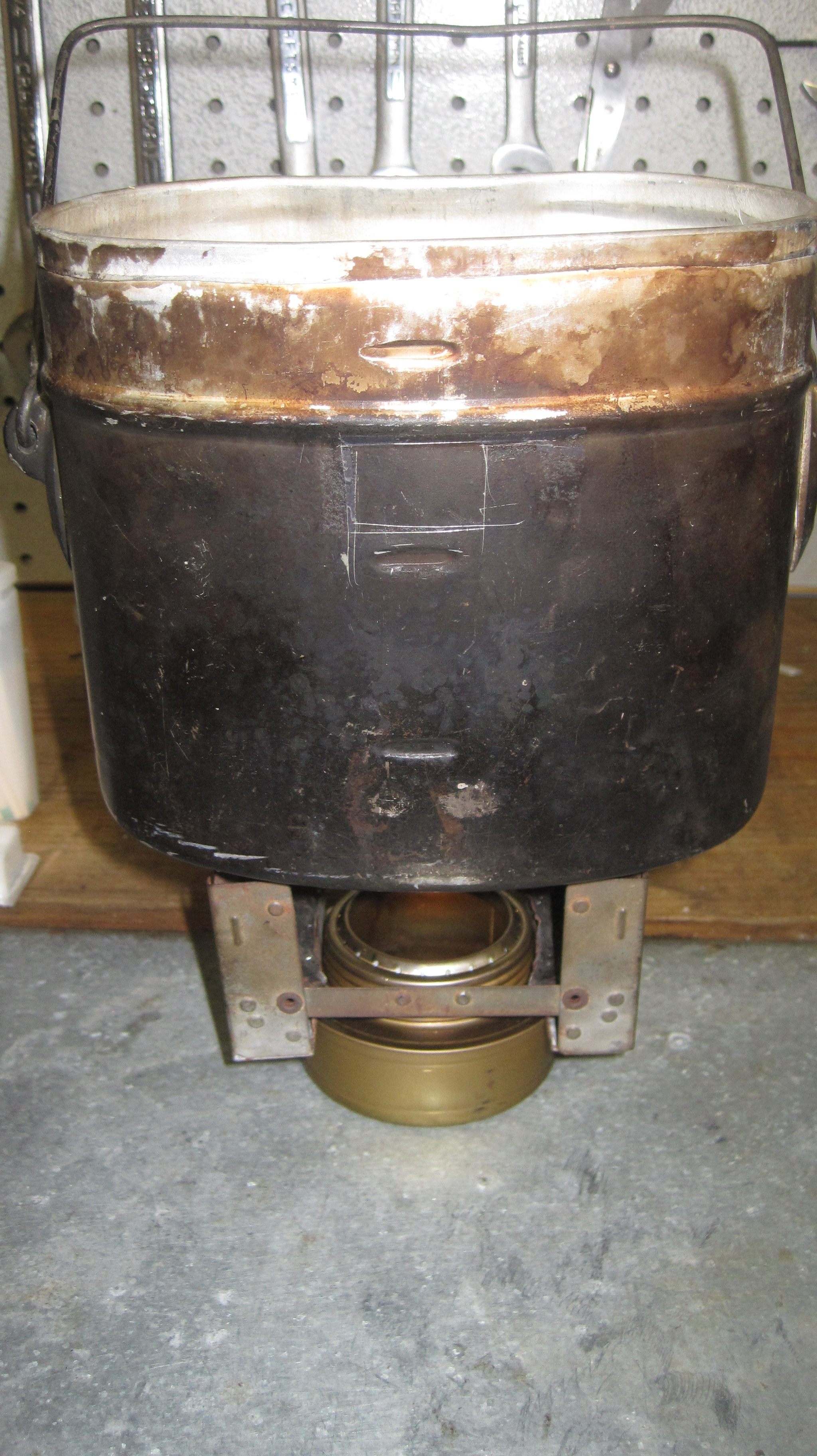 It's a clever little mod. The Trangia looks to fit at just the right height. I understand that the most efficient space below the pot is between an inch and a quarter and an inch and a half. With the optimal headspace being 1.4 inches. For any of these small stoves, regardless of the fuel, the flame-cone wants to focus right at the bottom of the pot without flaring too much. If you have flames licking up the pot sides, leaving soot and singeing the handles, your stove is up too close.