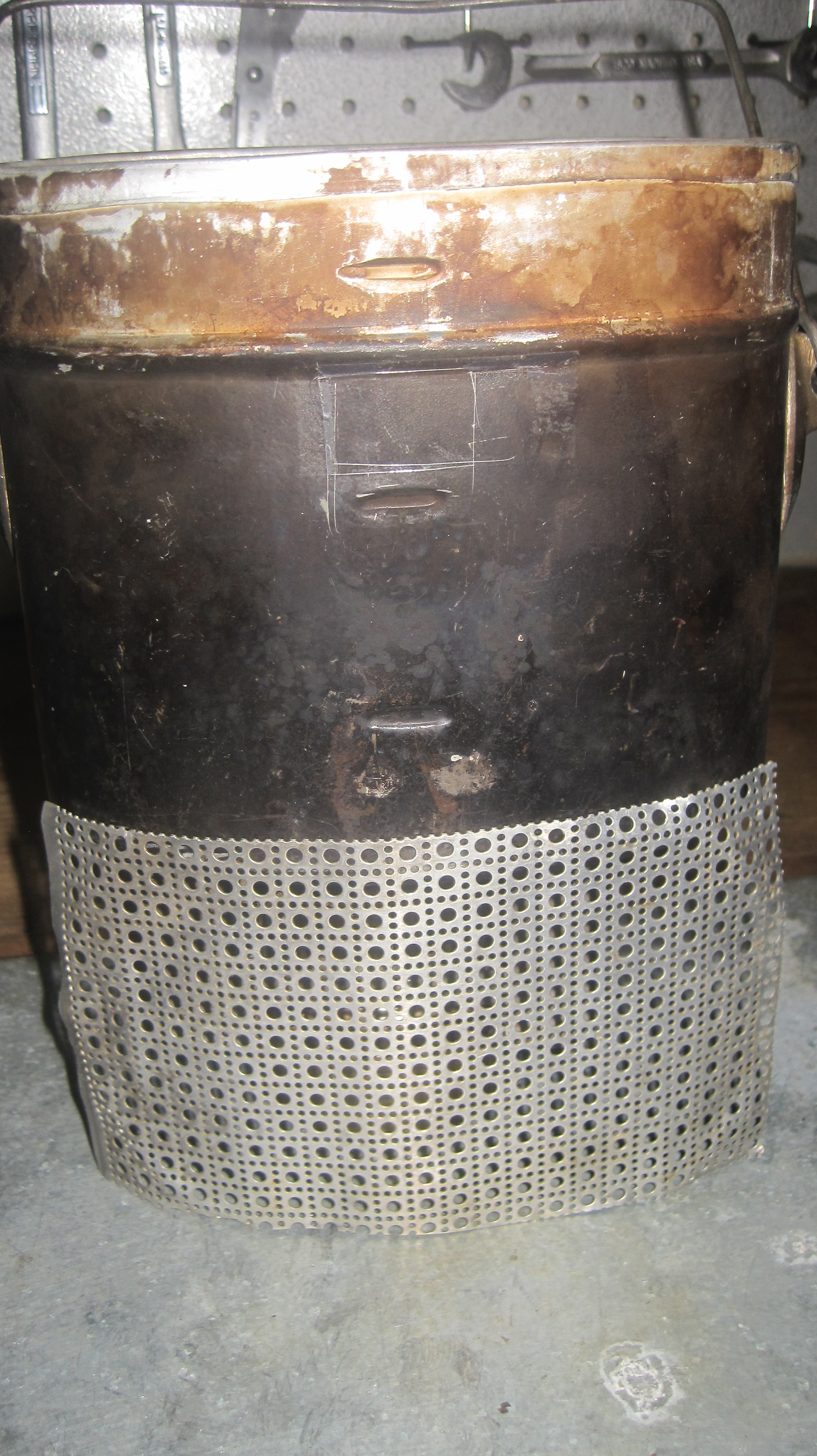 The problem I had was a windscreen and stove stand. So I cut a slot in the bottom to allow the Trangia throat to stick out.