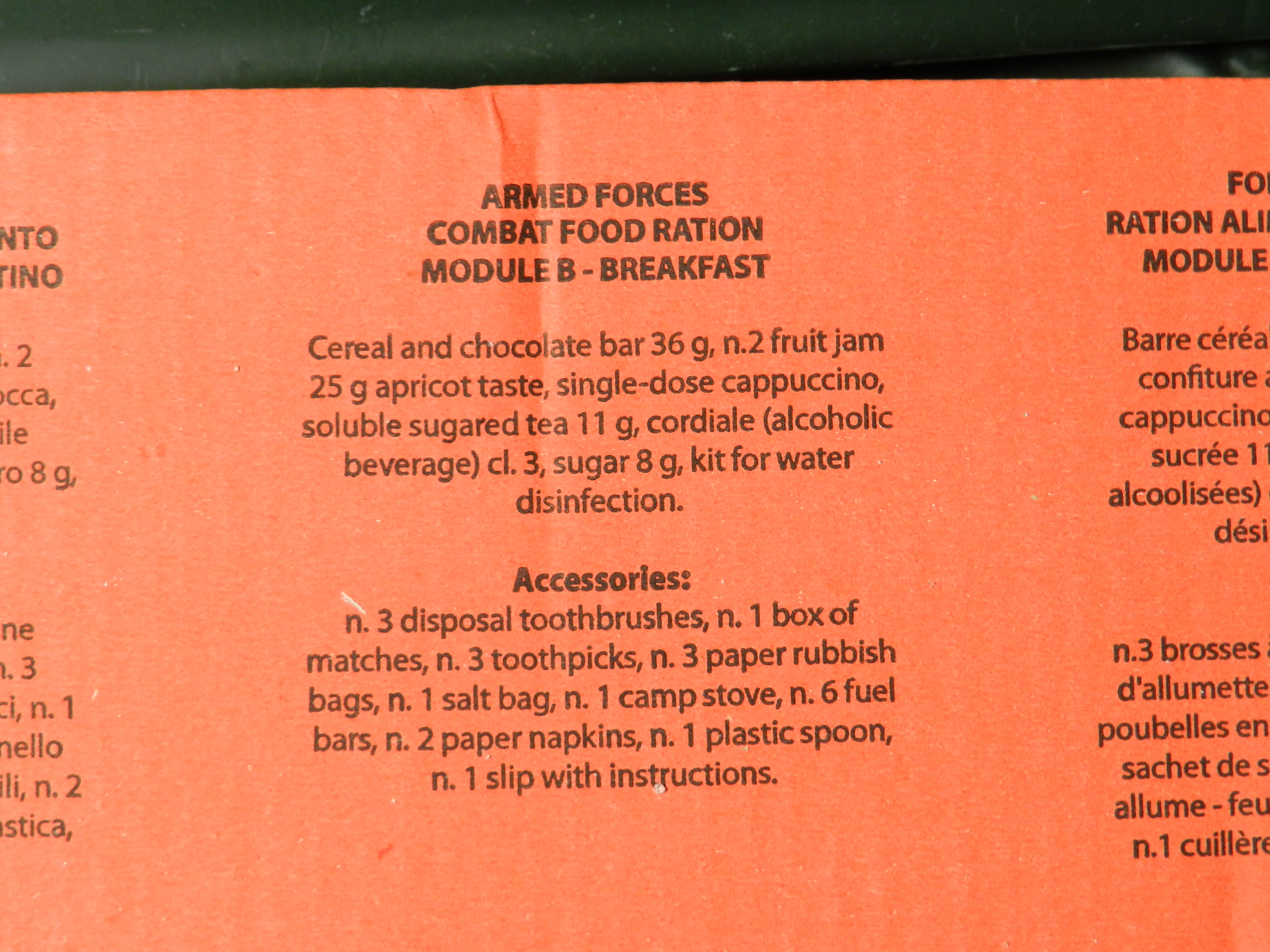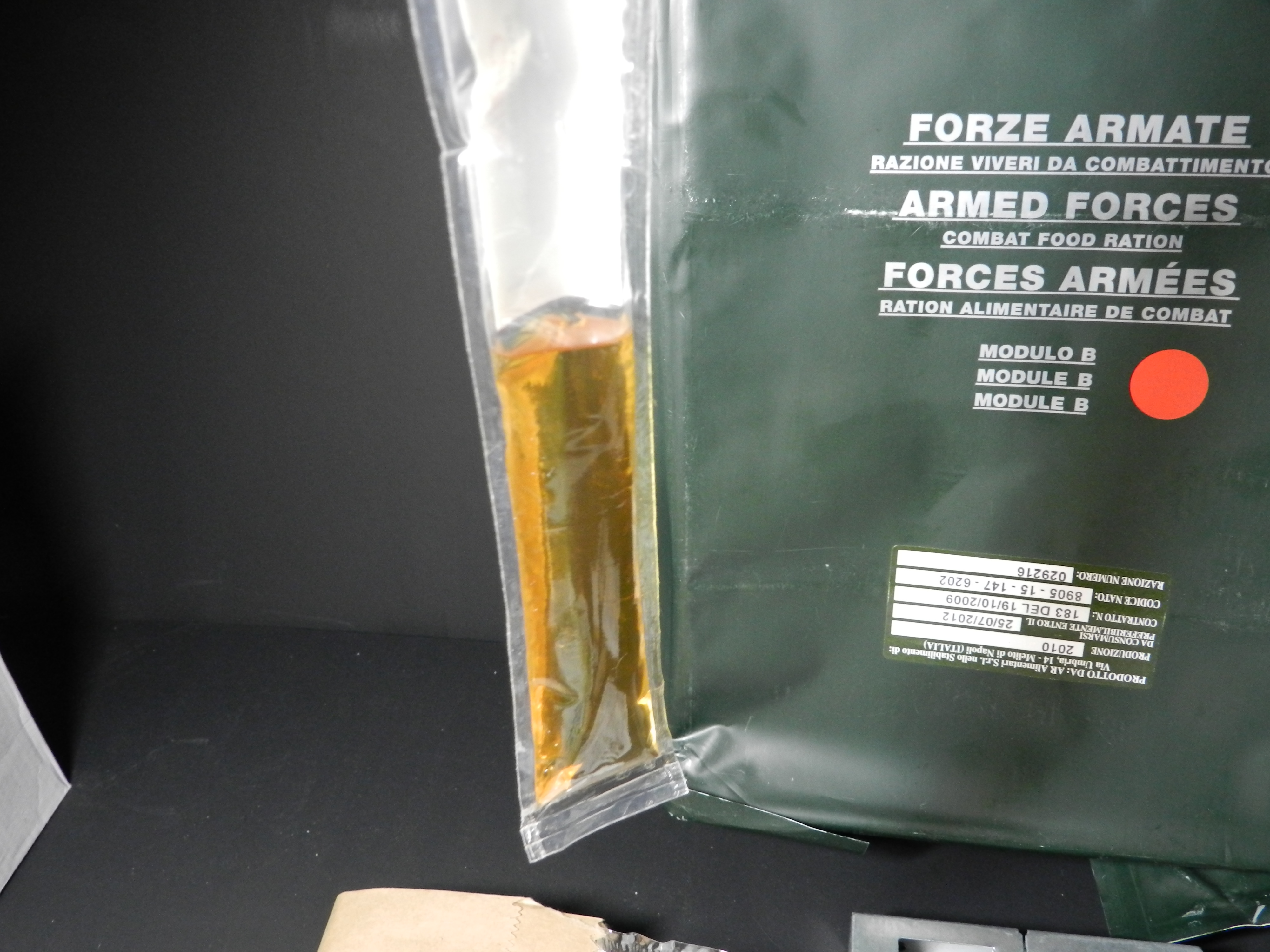 I finally got an Italian 24 hr Ration Module W/ the Red Sticker. Yes, the one with the Cordial Alcohol in the Breakfast Component. (I made sure I had it for breakfast on an empty stomach.. it gave me a ever so slight tingle and warming effect.
