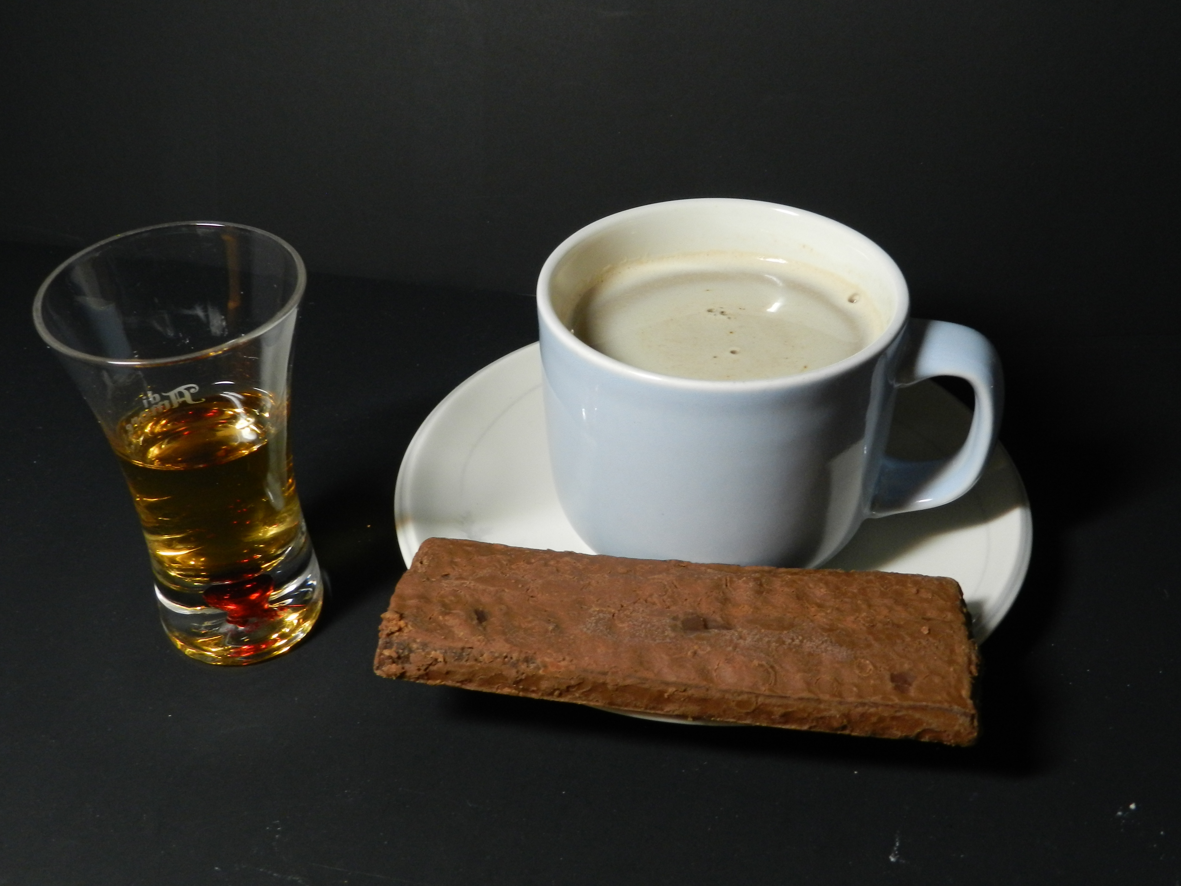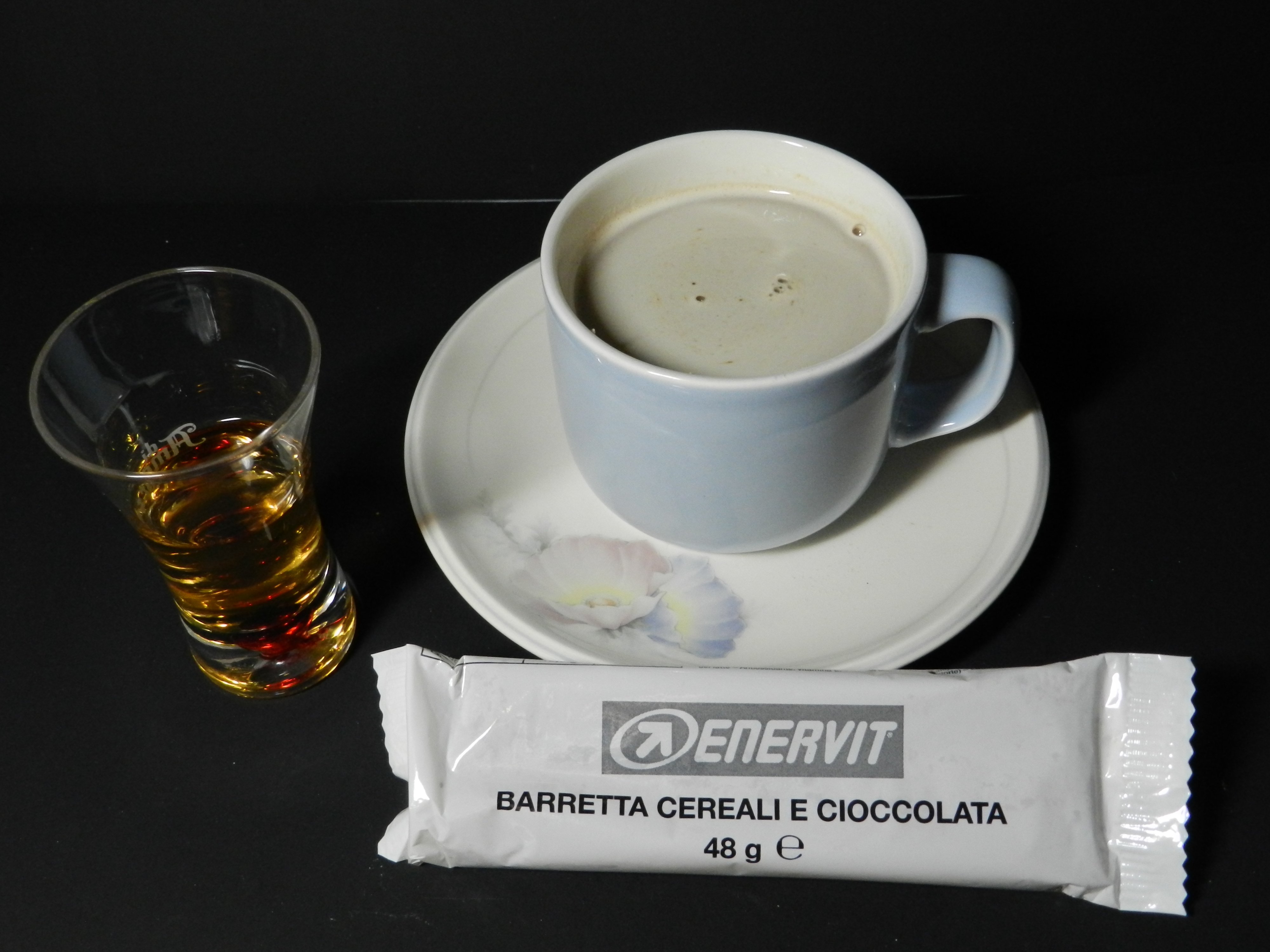 A chewy, rich chocolatey, hint of natural banana flavor cereal bar that was delicious, a cup of cappuccino that had a rich, nutty, and full flavor that wasn't sweet at all just the way I like my coffee, and of course.. the Cordial Alcohol.. what can I say it was a very good quality brandy not cheap.. it was more like a mid to top shelf quality even though in a plastic pouch. It didn't burn going down, and I picked up an almost sweet caramel undertone to it whilst sipping it along with the cappuccino as a direct accompaniment to the Cordial.