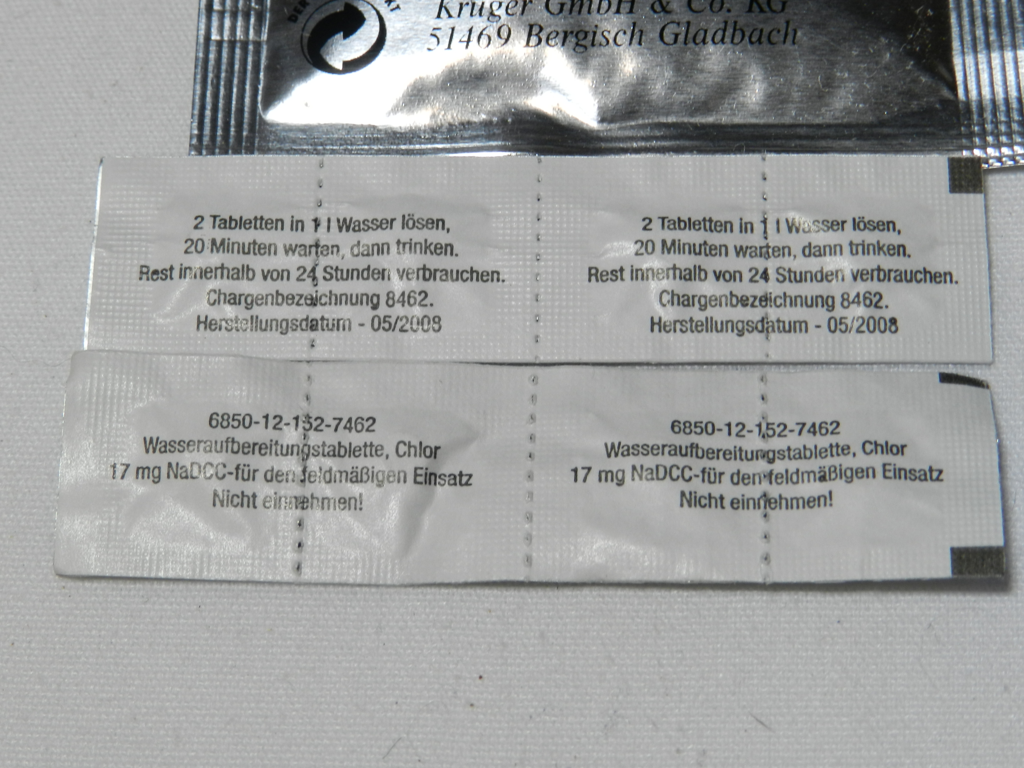 About the water purification, it says use 2 tablets for 1 liter (= 0,91 quart), let it sit for 20 min before drinking. Use within 24hrs.