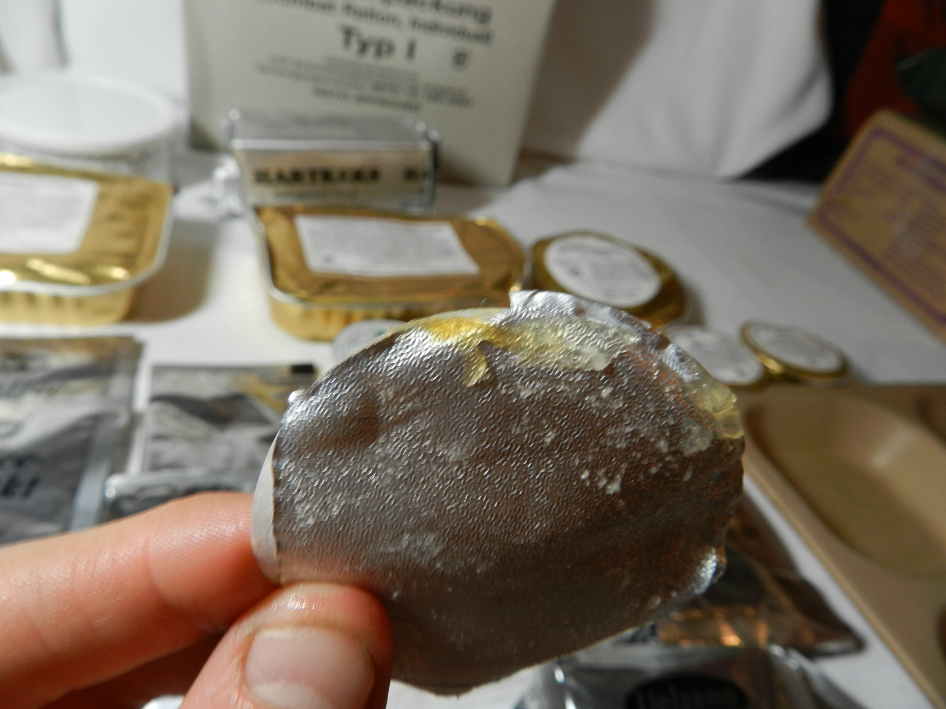 This is why: That top label in conjunction with the gelatinous fat surrounding the bierwurst created a thin protective seal that essentially kept it preserved. That Bierwurst was maybe 15-20% drier than the other 2 Wursts in this Ration.