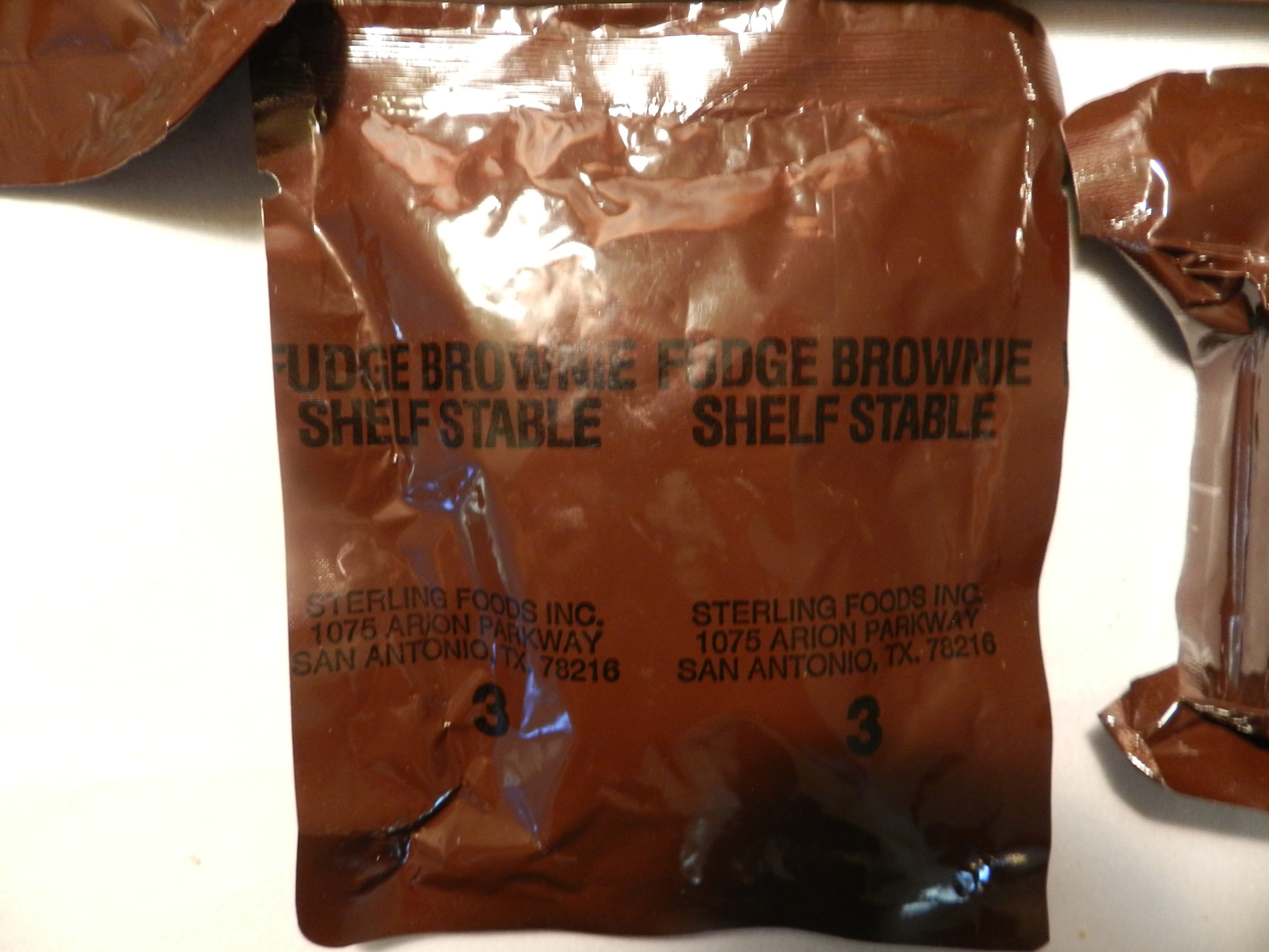 It's more moist than old school mre brownies. Same flavor, different consistancy. The texture is moist, spongy, and the flavor is up to par on my standards, but Carol says it's not "fudgy" enough. So my thoughts for Sterling Foods? Add more cocoa!