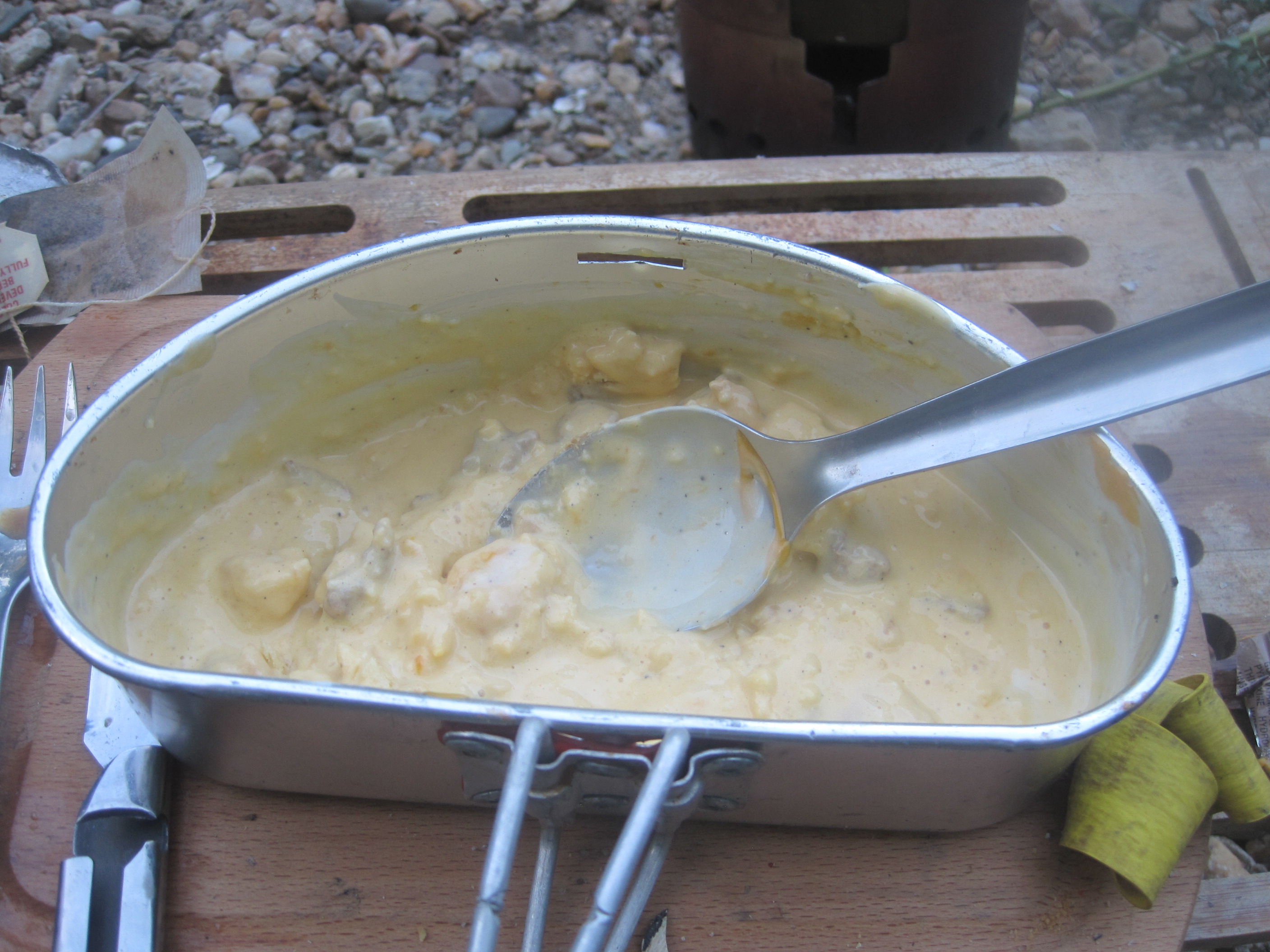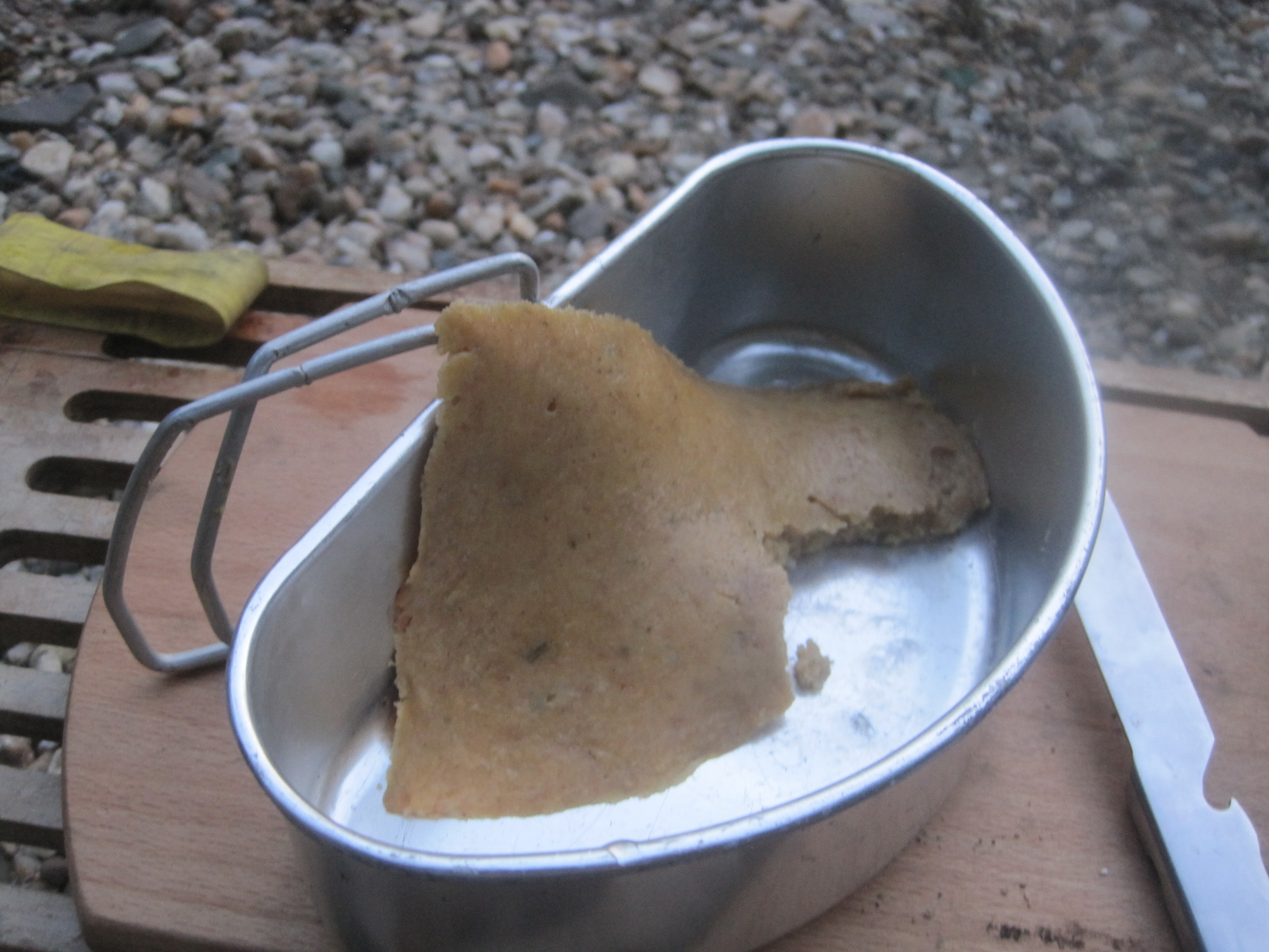 Cooked with Russian Army kettle and Swedish stove. The stainless steel cup is a gift from my Friend Prado67. This cup is Russian Issue and kept the Iced Tea cold and Coffee. Yet did not burn my lips. The paint on the Russian kettle did not blacken and stayed their particular Olive color. As for trip the weather was perfect just a little hot. Clear sky at night and you could see the stars.The river was low but it ran clear so you could see fish and river plants just like a fish tank. This is why I like miltary rations and gear. It lends itself to my needs. Simple easy to use and prepare.