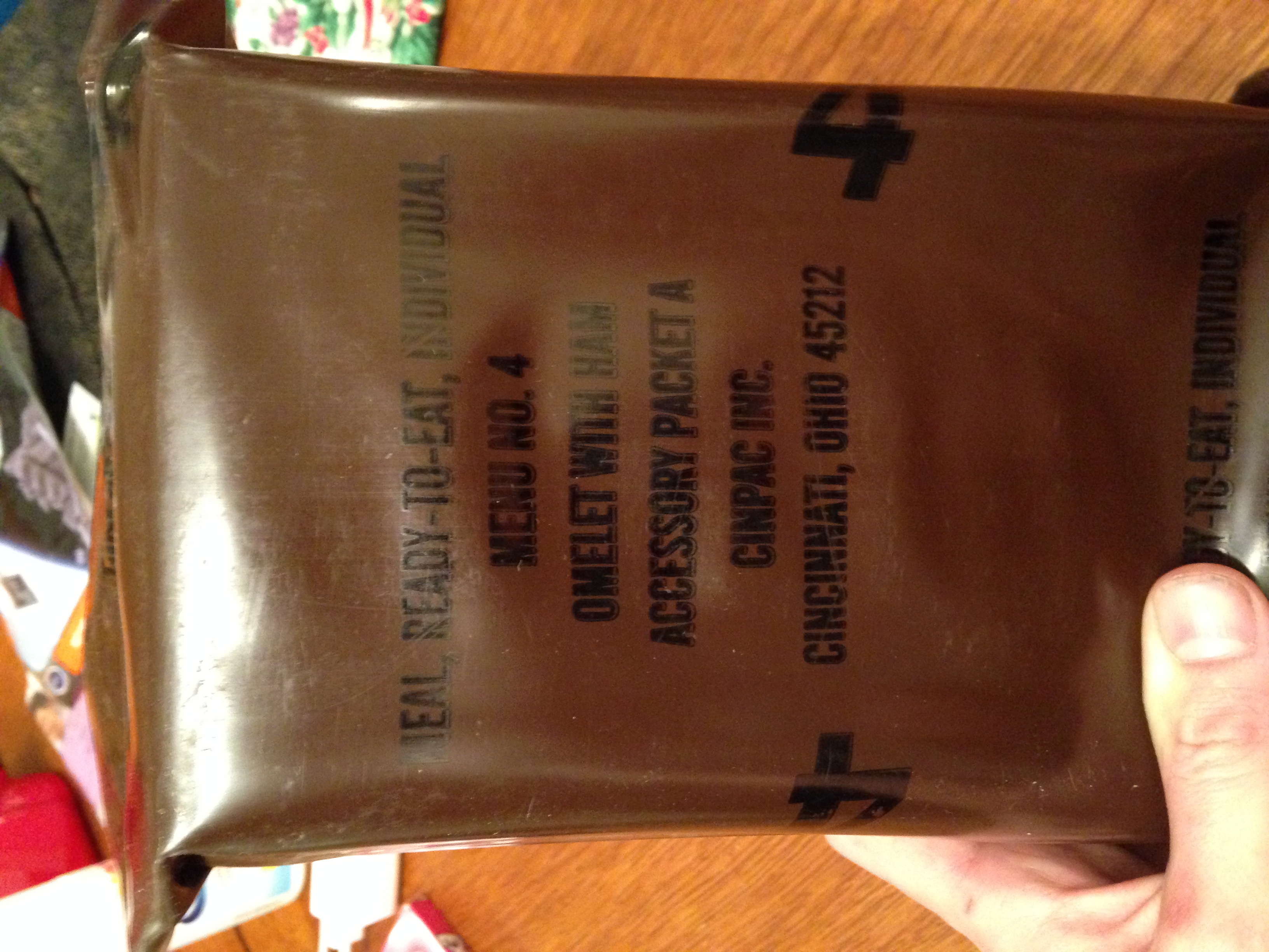 This bag was terrible to open, the tear notch was basically never cut all the way through. But that will never stop me! I WILL NEVER BE DEFEATED BY AN MRE BAG!