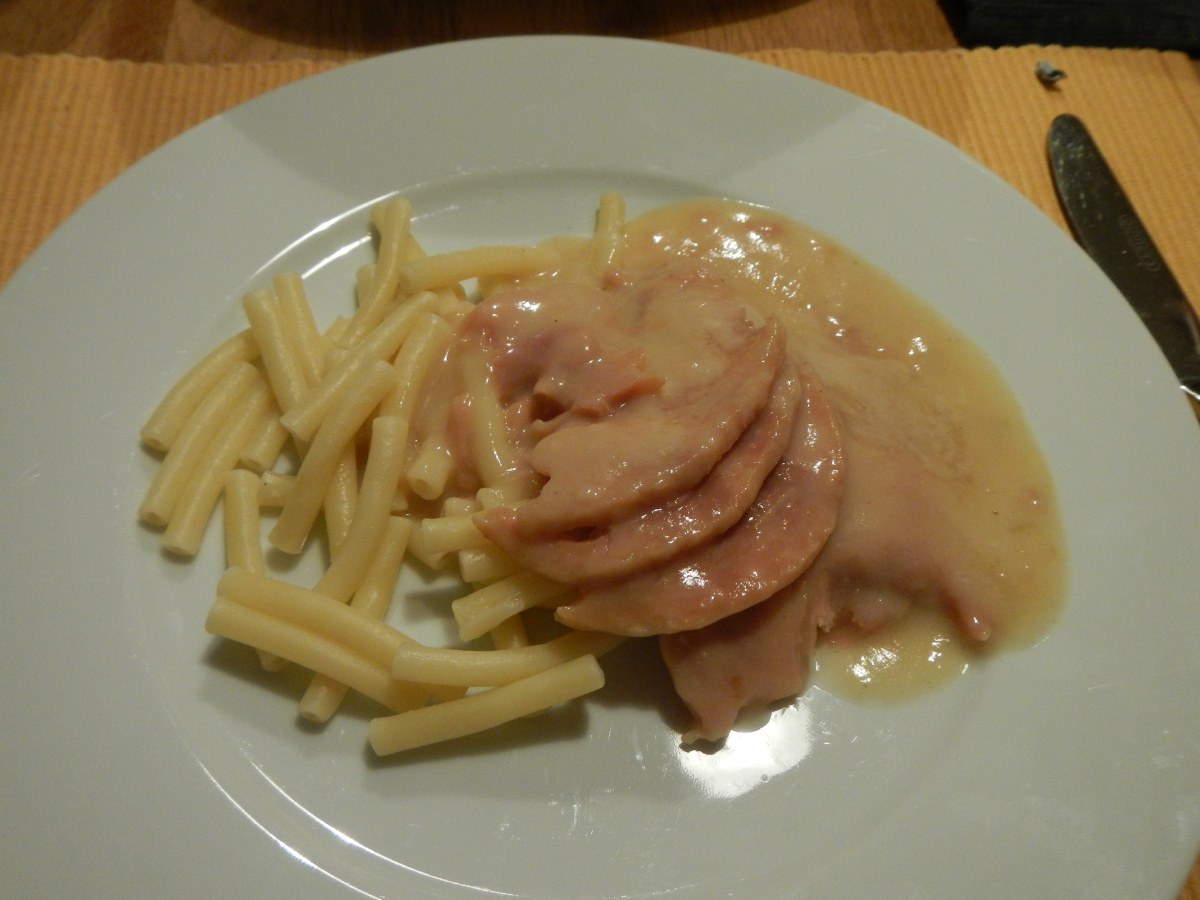 My plate with turkey slice and noodles. The turkey was very tender and I liked the "thin" slices, the gravy had a nice, salty taste. I really like that dish and would have it again. After a little cooling down, you noticed a slightly metallic taste, but we kept eating it.