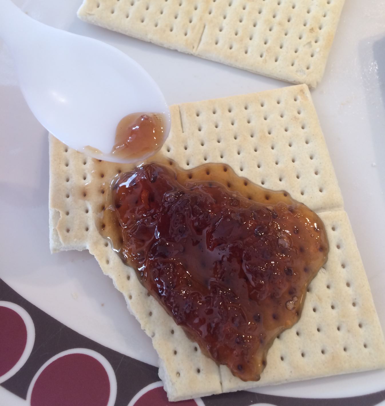 Last was the apple jelly. I put it on a cracker and sampled it with the spoon. Nothing unusual noted with smell, although it smelled very mild. It tasted perfectly fine. It was pretty mild, which was nice. Not very sweet or fruity, but enough flavor to leave no doubt what you were eating.