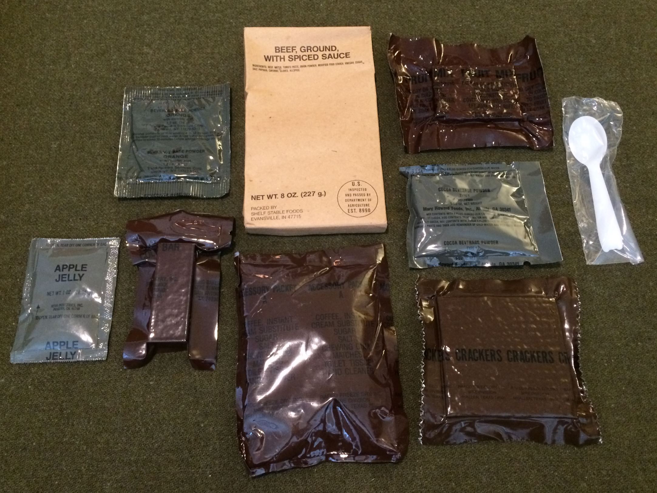 Now, I must point out that I was a bit confused by this MRE. The menu lineup for 1987 does indeed show this menu as menu 12. As I went through the components however, I noted that many of them were 1988 production. I checked the menu lineup for 1988 to see if this could be a 1988 production with some leftover 1987 components (which could make perfect sense), but the 1988 menu 12 is Escalloped Potatoes. Hmmmm, not sure. Ideas?