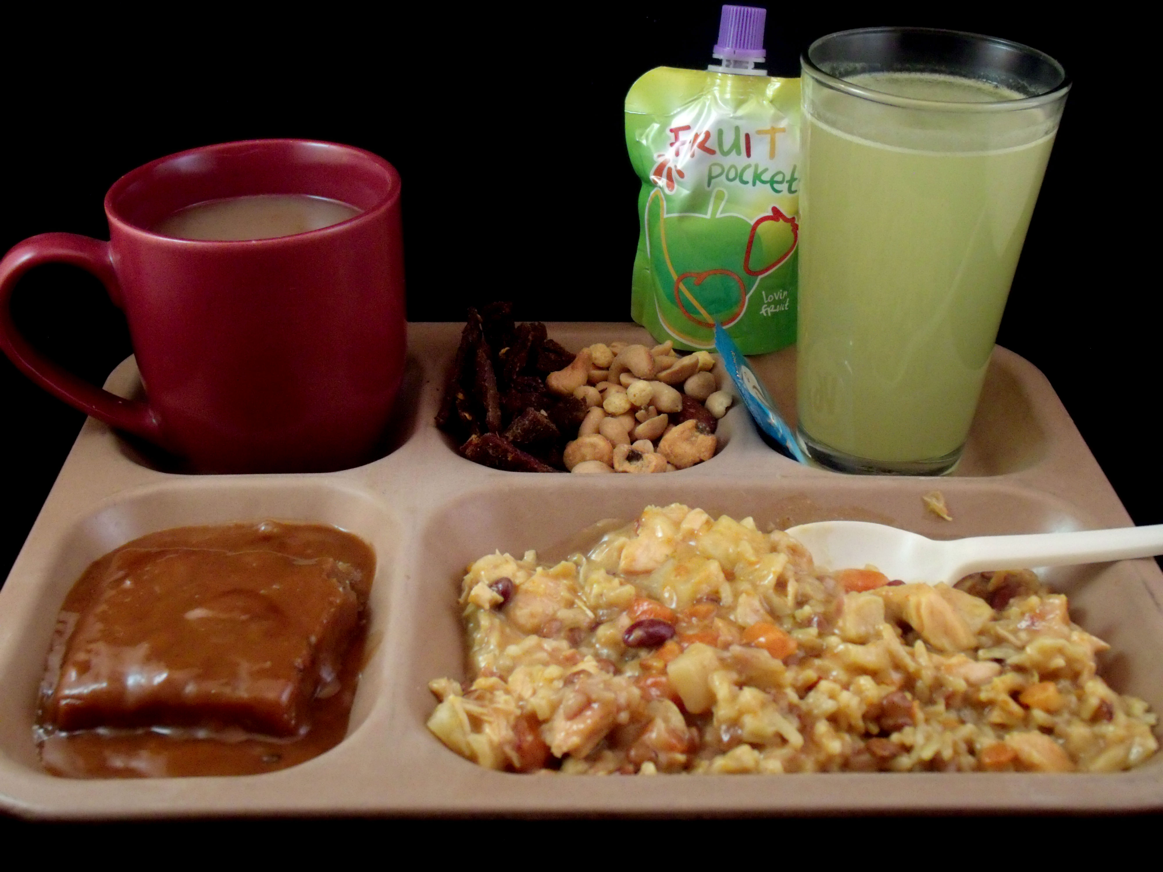The main course - Chicken in Yellow Curry & Rice - was a nice mild yellow curry with beans, carrots and potatoes. I ended up adding in the green Tobasco for the second half - that was definitely interesting! The curry was always there to finish out the aftertaste and I think they went well together. It was the only thing in the ration that would make sense with hot sauce (as far as I could tell) so it seemed worth the risk