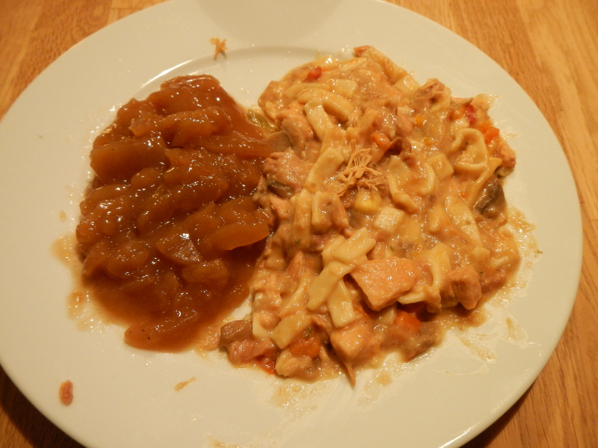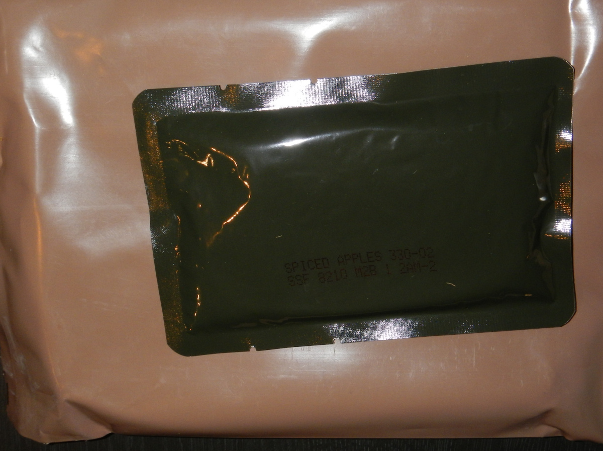 The opened (2008) pouch with entree (chicken with noodles) and a side (spiced apples - yummi!!)