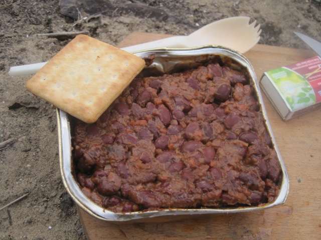 The beans or lintels were very firm. The tomato sauce type base was very thick and could have used about one table spoon of boiling water to make a better broth. Has I eaten it in the mess tin I would have added one or two tablespoons of water to thin out the sauce. The flavor was also very mild and was missing the Typical American Spice for Chili type meals Cumin I added a good dash of MRE Tabasco and it was then very palatable. This was extremely dense and filled me up quickly. I had to force myself to finish the entire tin. I would have no problem eating this meal again and I think the key for these Russian Main Course entrees is to heat them up and get the juices mixed together
