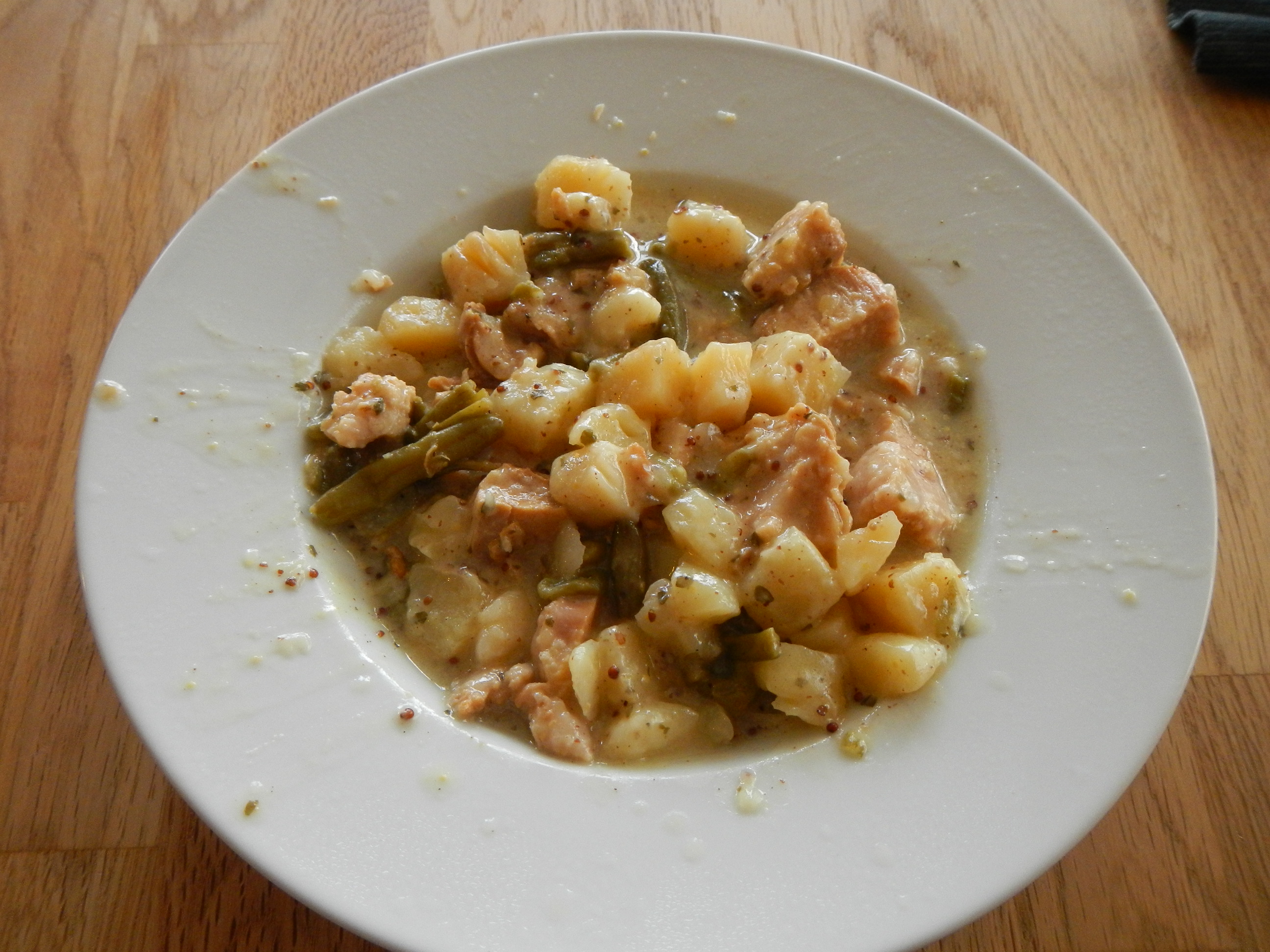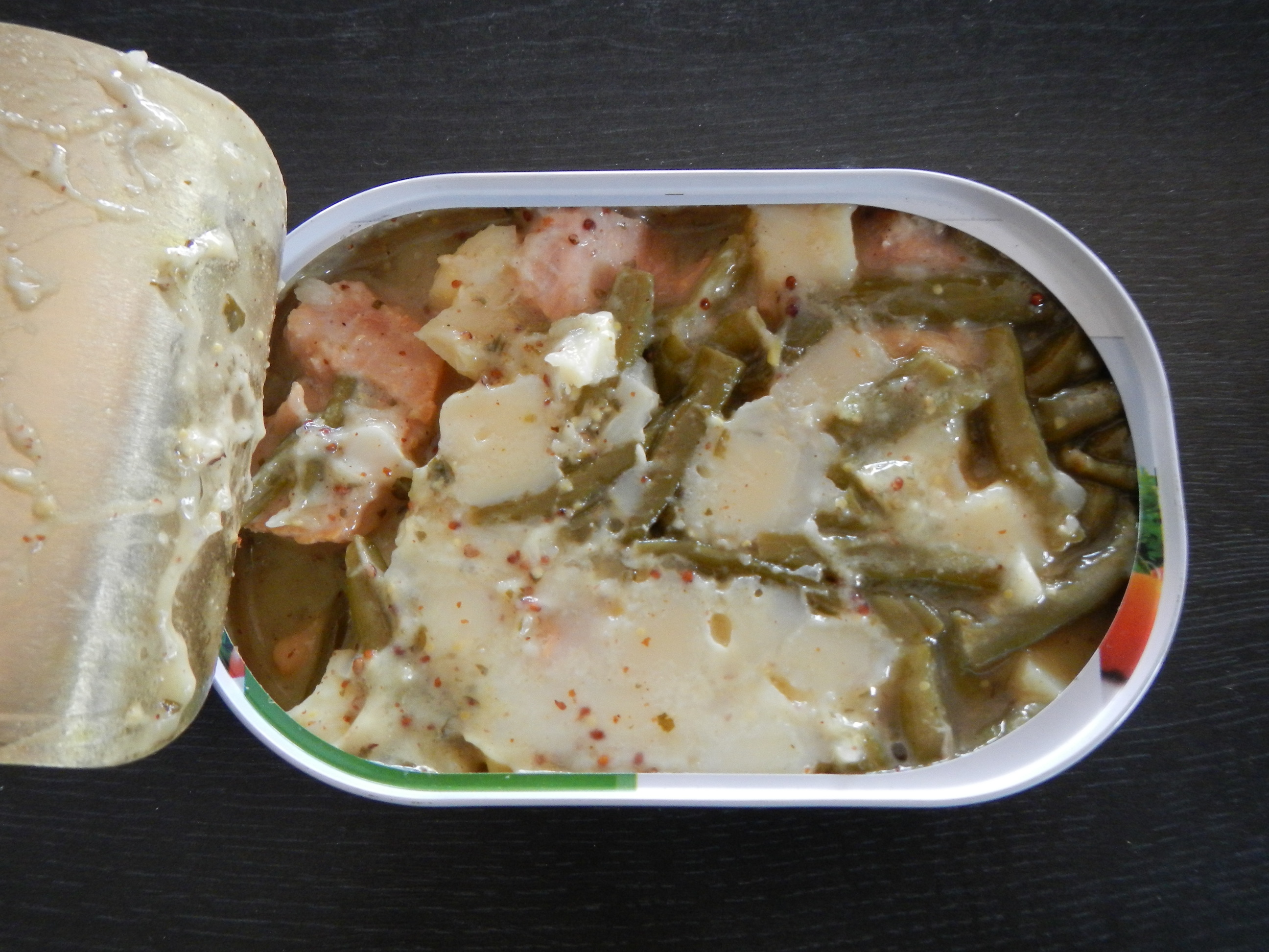 hmm...a sour cream and mustard sauce...interesting...Pork, green beans, potatoes...almost sounds like a southern potato salad with pork and green beans...I could see that being a canned meal....you've given me an idea.... ;)