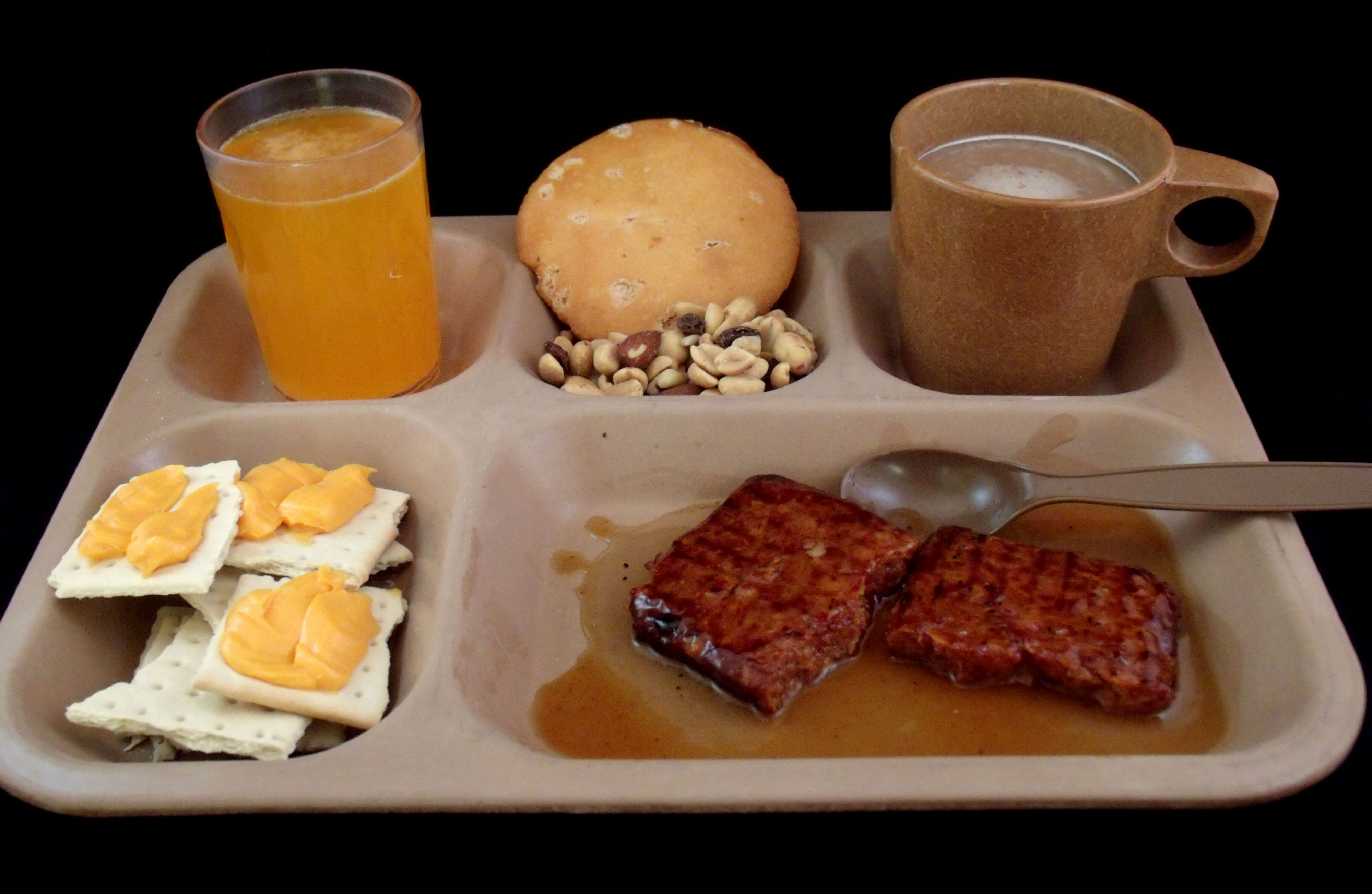 Orange drink goes great with the sausage. This ration comes with Orange Beverage Powder Type 3. I only used a portion of it for what you can see in the photo, and had enough left over for a second tumbler full. The coffee and maple muffin top were a fantastic pair