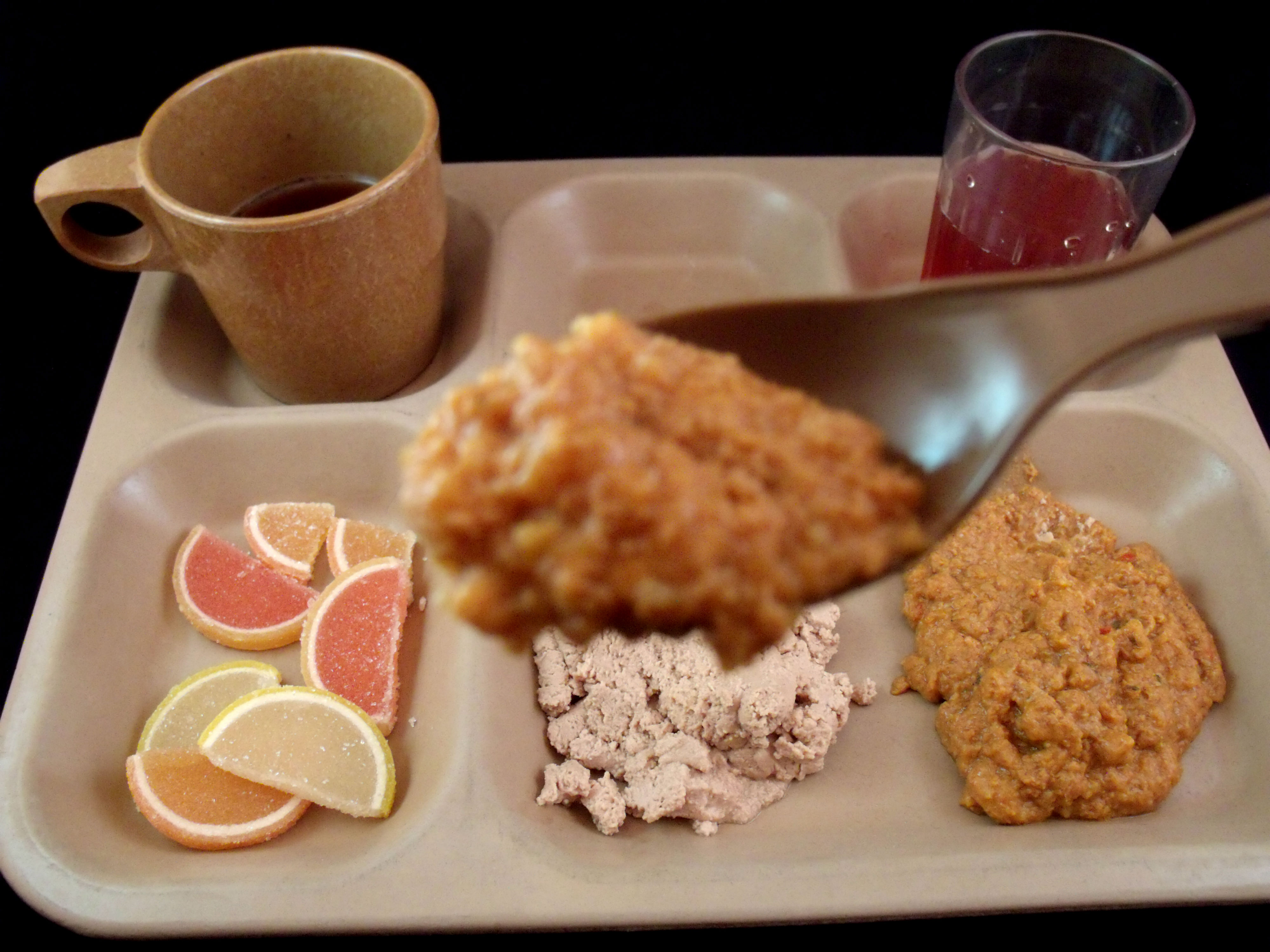With the meal I had two drinks. The first was a tube of ready-to-drink Cherry and Apple Juice. I had to unscrew the top and pierce the tube, then screw the cap back on. I poured some into a clear tumbler for the review pictures, but I drank the remainder from the tube directly. Just like a boxed apple/cherry juice - real fruit juice as far as I could tell. The second drink was the ISS Earl Gray Tea. I opened the end of the pound and unwound the filling tube. This would attach to a hot water dispenser on the space station in order to have the water piped directly to the tea and sugar. It called for 200ml of hot water and made a nice smooth tasting drink.Cottage cheese solids, mashed blackcurrant, refined granulated sugar, butter, water, semolina groats