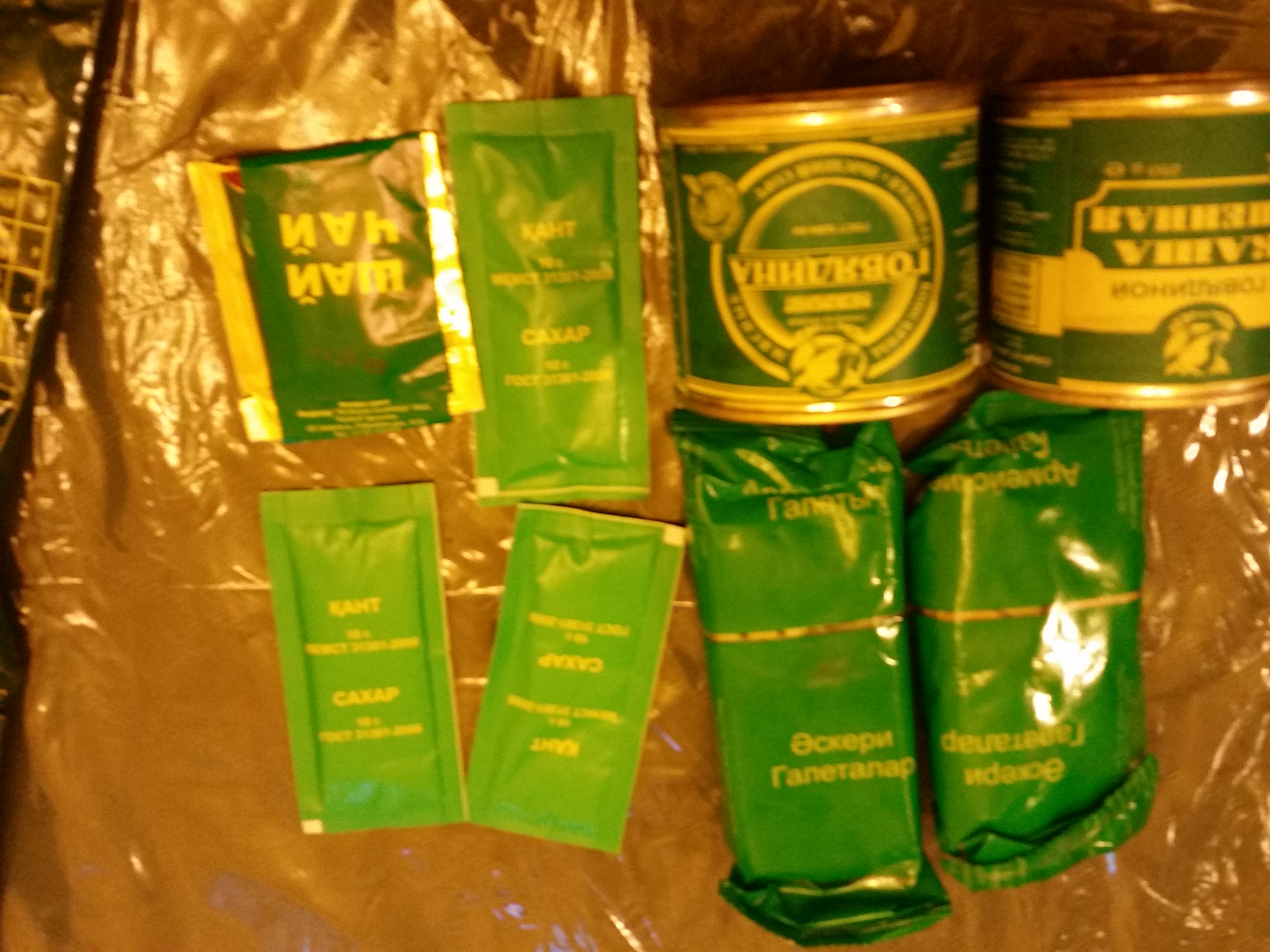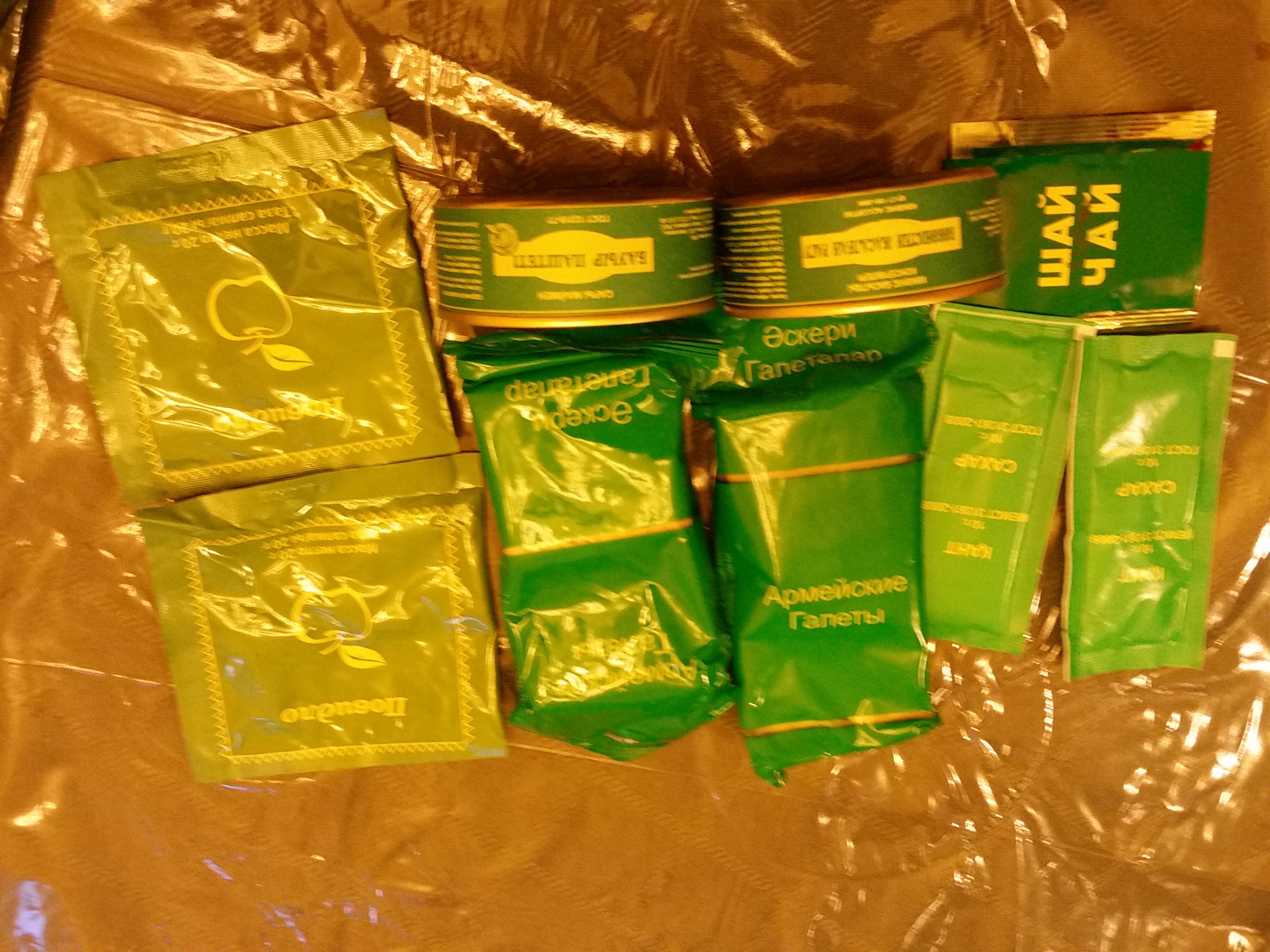All meals included a pack of tea, 2-3 packs of sugar and 2 packs of crackers. The crackers were the best tasting I have gotten in any ration, foreign or domestic! The tea was so so even with plenty of sugar. They are manufactured in Russia for Kazakhstan and closely resemble the Russian IRPs in taste and type of items.