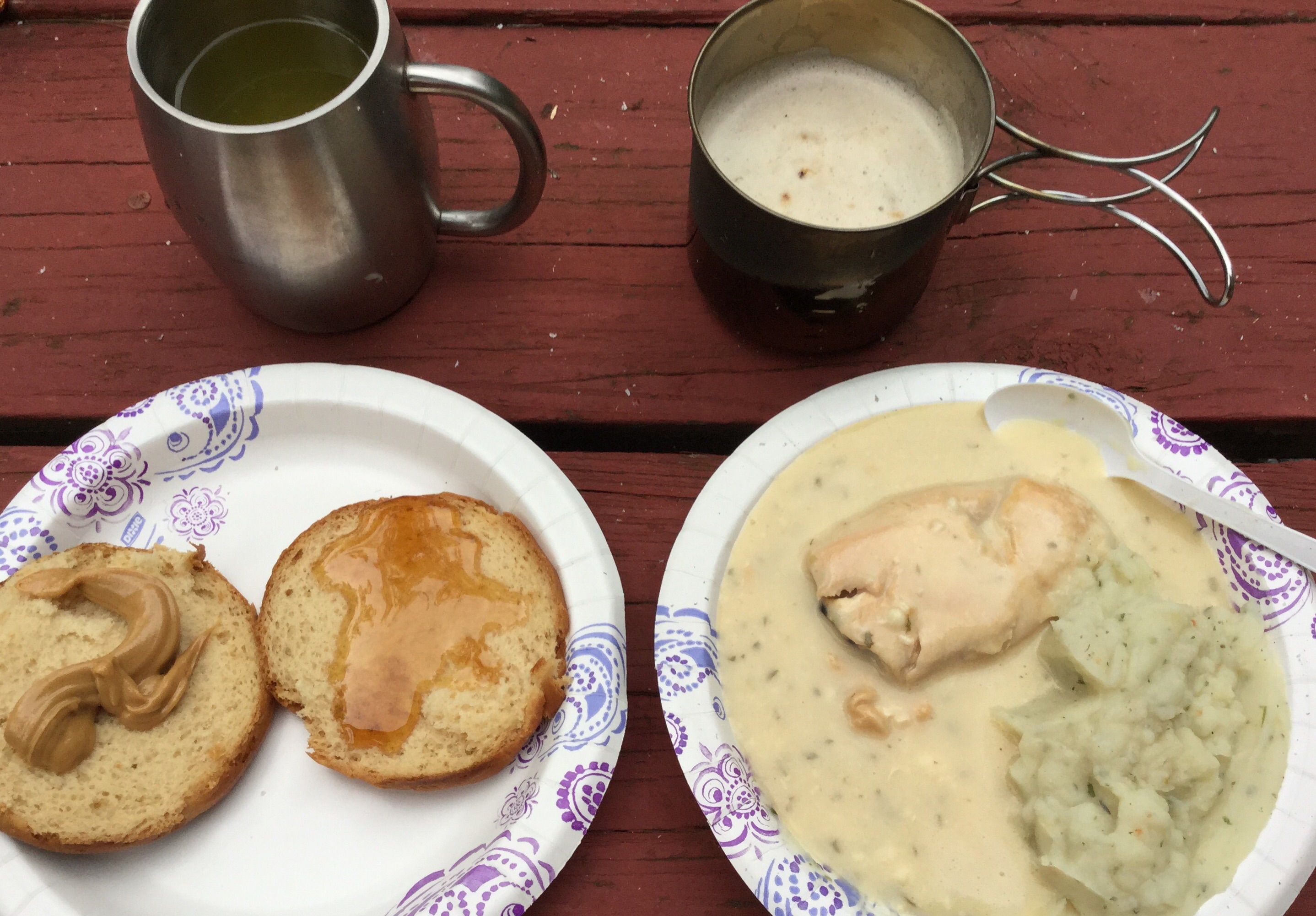 After getting the fire going and the water boiling in my pot for the main and in a cup for the coffee, I decided to get started with the sliced pears. While I was mildly disappointed to see only four slices, it was a nice change from cubed pears and they were rich, sweet, and very juicy. I always chuckle to myself when I see the fruit box labeled as dessert. Lol