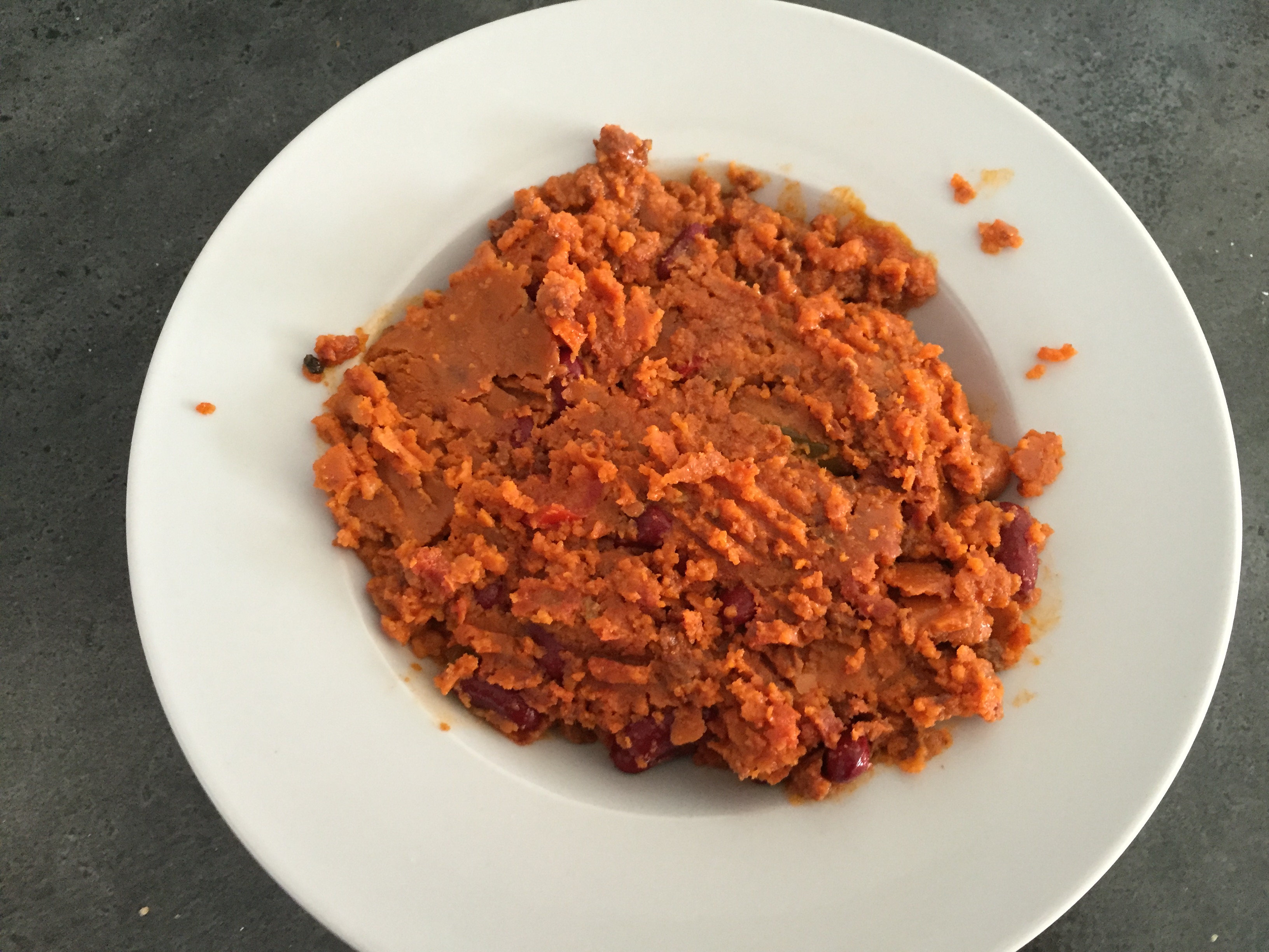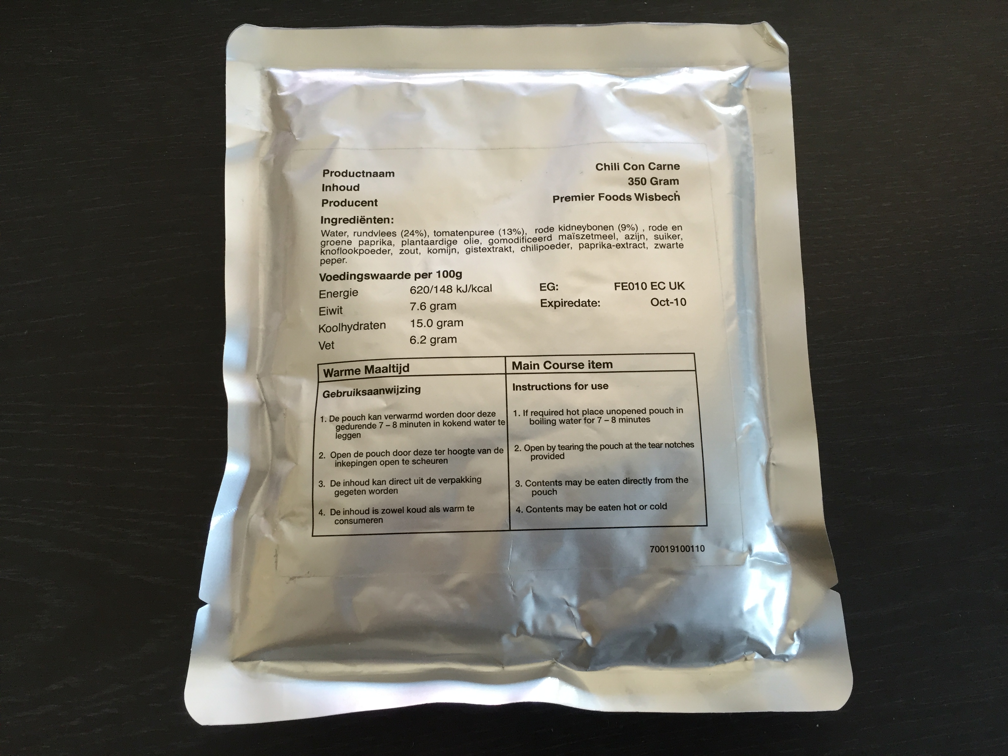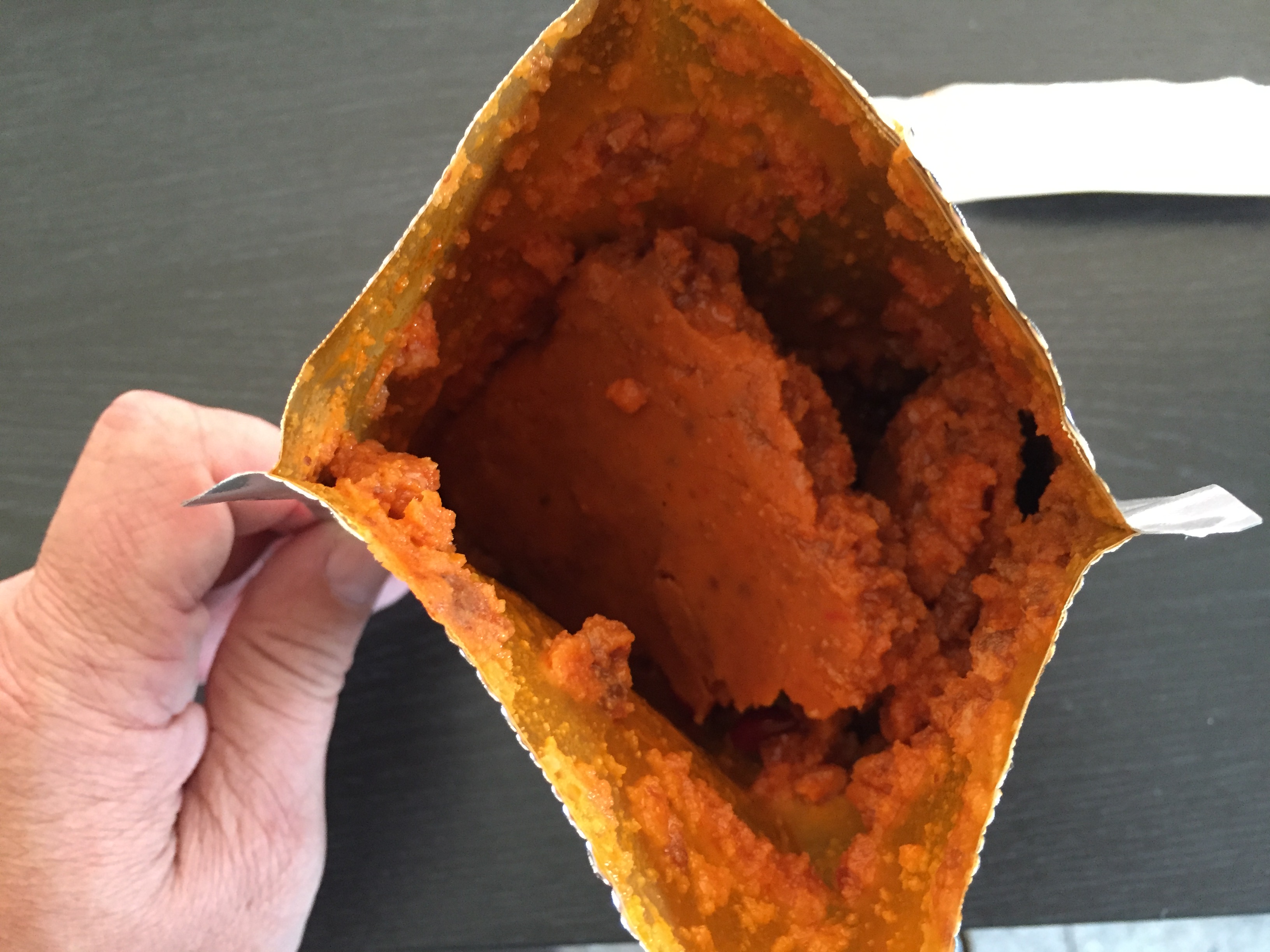 Chili Con Carne The opened pouch, just 5 years old No bad smell After nuking A nice and just very litte spicy taste. The beans had a little "solid" texture