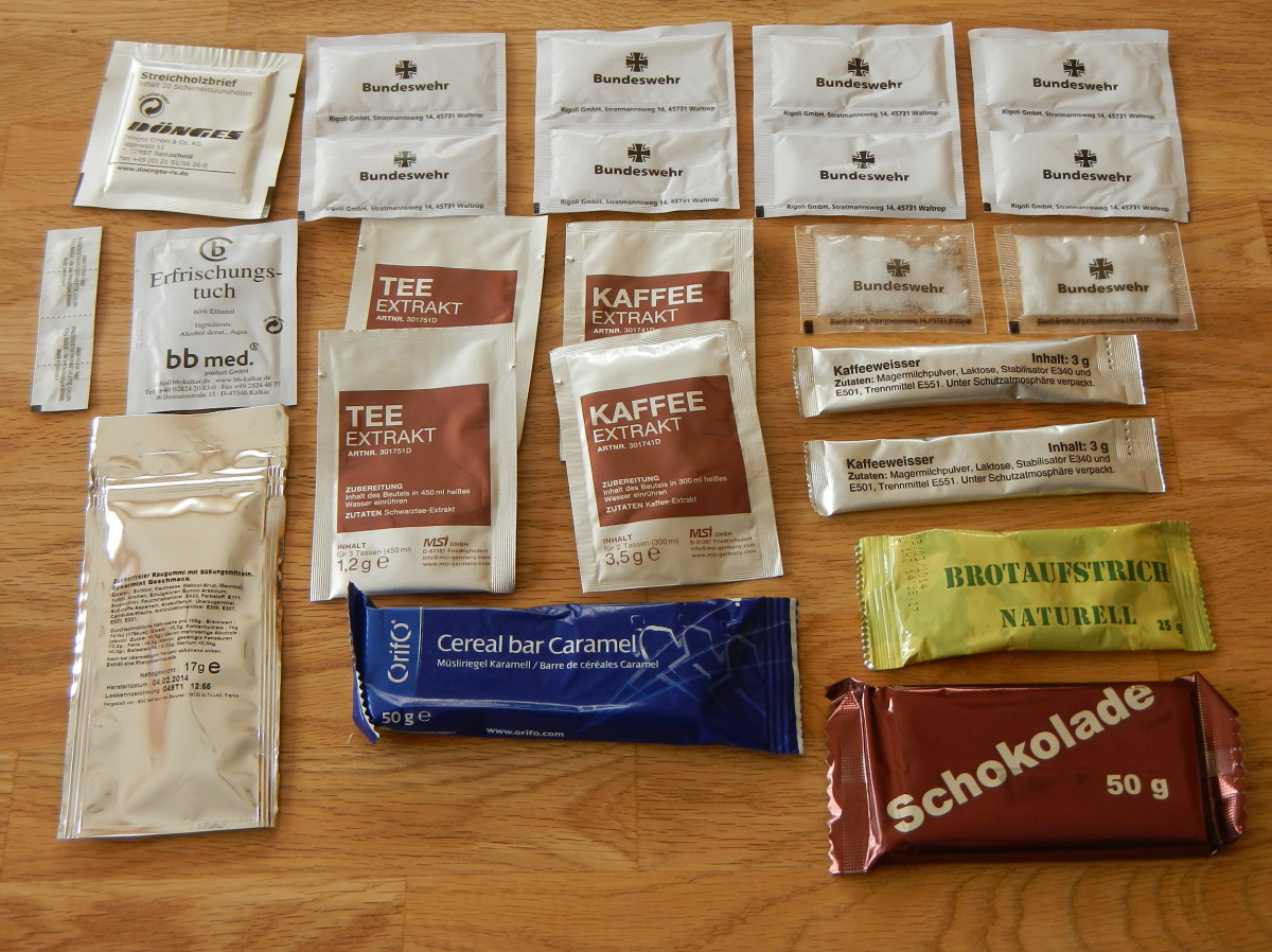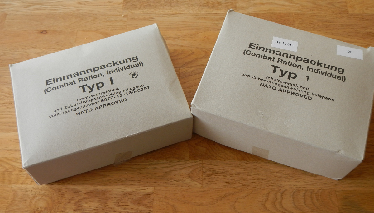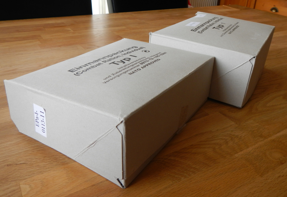 New numbers it´s bigger It weights a little more Typ I as you know it The new Typ 1 with new pouches Typ I entrees Typ 1 different entrees Typ I pate + marmelade Typ 1 still the same amount Typ I satchets Typ 1, note much more sugar now (8 satches), just one butter replacment but now a cereal bar Typ I canned bread, crackers ("armor sheets"), "snack" (either fruit salad or semolina) Typ 1, still canned bread, just different labeling, new crackers, no snack anymore These are now brand new in the EPas:
