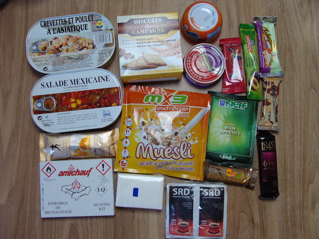 the content of the ration The breakfast- muesli, coffee, chocolate crackers with plum jam and the fruit nougat The lunch/dinner part Lunch/dinner prepared: left to right