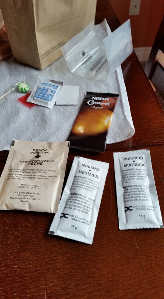All the odds and ends left over. Second peach drink for later. I hate mustard so that'll get thrown into the accessory bag with the other things I don't use in all the rations I've had. I rarely ever drink caffeine, so most "accessory packet" type stuff usually never gets used.