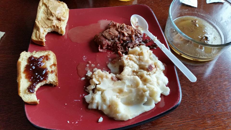 Smoked Meat and instant Mashed Potatoes as main and side... had to use some of the sauce to reconstitute what is called IMP potato "corner powder" that doesn't quite get mixed up right in the pouch. We've all seen the horror of this on several review channels on YouTube.... they should redesign the bags somehow. It always seems like the spoon clumps up right away after a few stirs and then you just can't really get down into those corners without feeling like you're going to burst through the pouch.