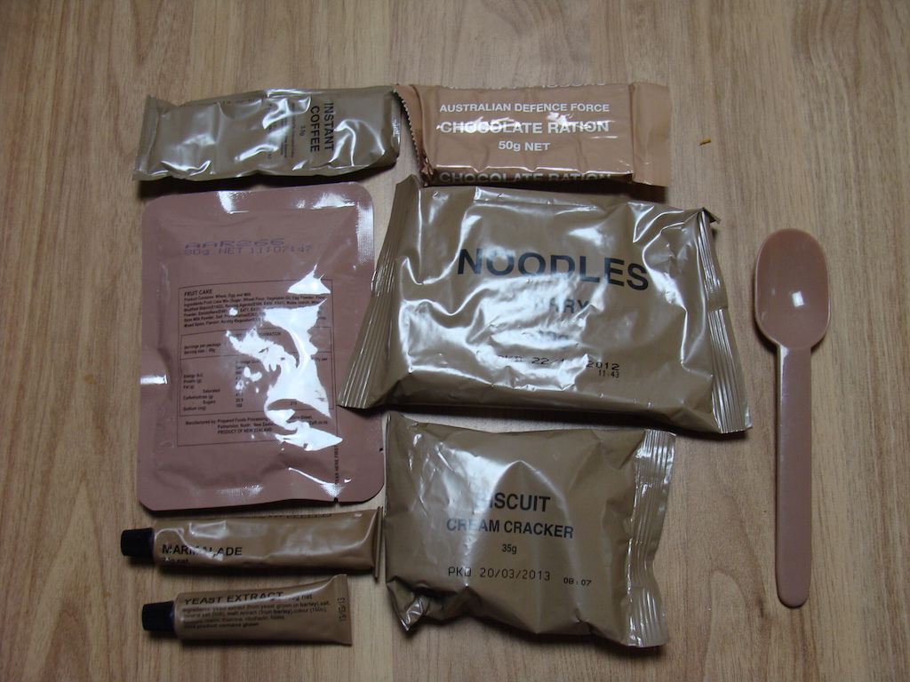 It has no division between meals, there are 2 entrees (or maybe 2,5). For the breakfast I had: curry noodles,biscuits,chocolate,coffee,marmelade,yeast extract and fruit cake