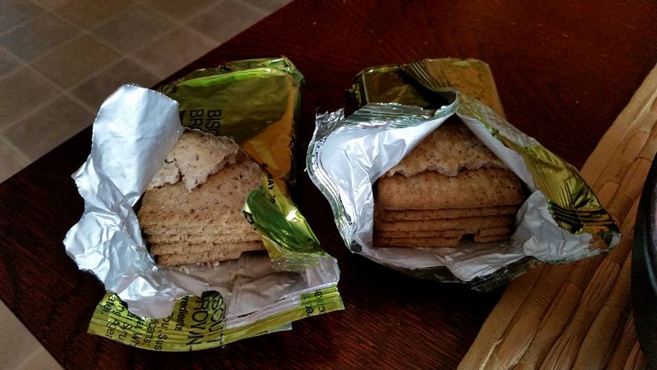 Next up, the biscuits. The package on the left was in the 24hr ORP but was COMPROMISED.... a very big hole in the side of the package, thus they had the texture of moderately hard cardboard... but oddly didn't taste too bad. On the right we have an extra packet of Biscuits sent to me in a separate bag in the package. These are 10 years old..... *insert ominous music*. They are a bit darker than the new biscuits, but that may be because they haven't been exposed to air and aren't stale.