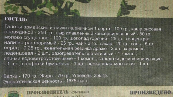 It's commercial ration 1 individual meal, they have 12 menues available. Modules are A -breakfast, B -lunch, C - dinner and each have four menues 1/2/3/4. Food is from the same company that makes it for the RF Armed Forces.