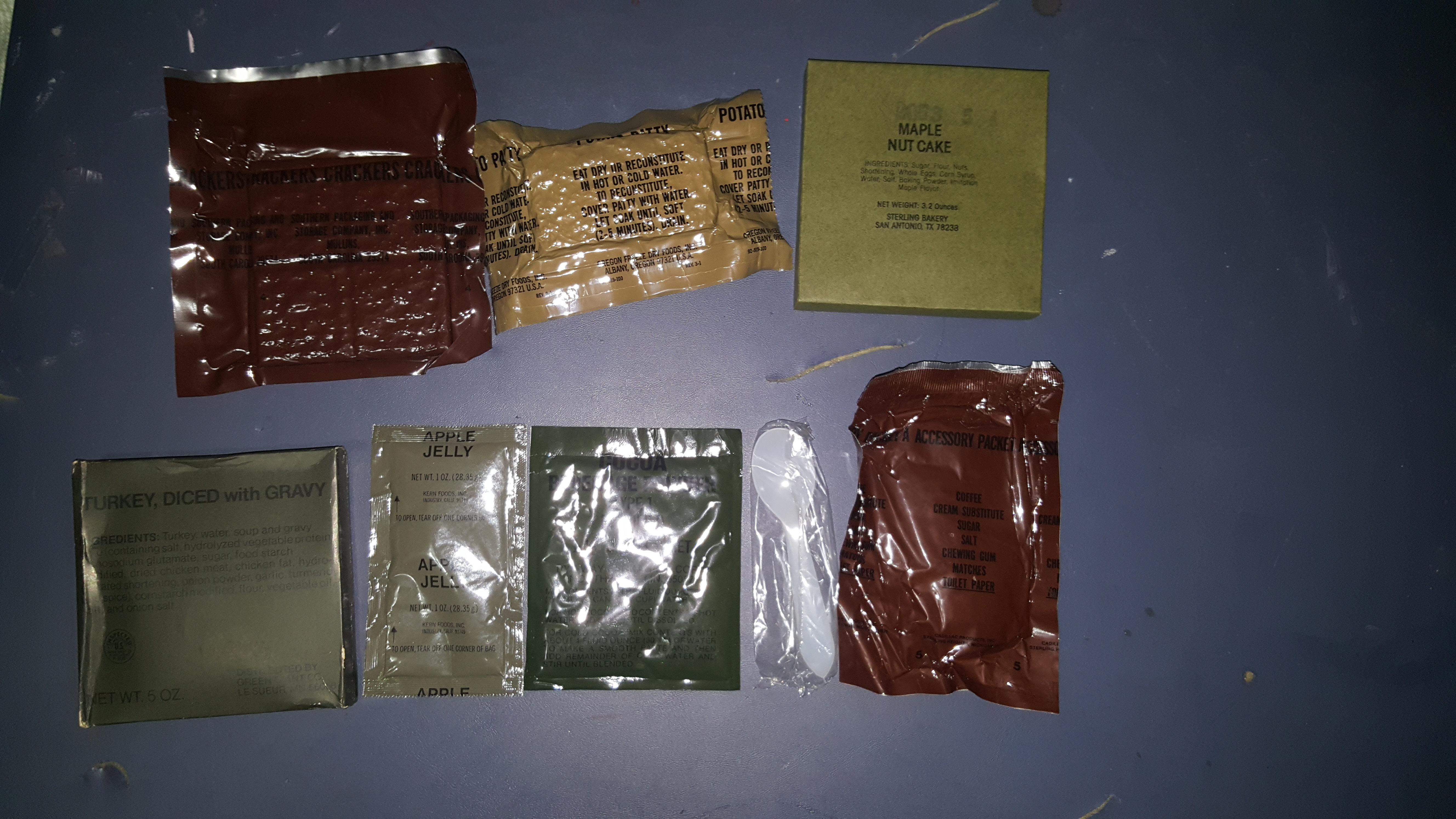 Here are the retort pouches and crackers laid out. The maple nut cake was produced on "2053", proving that this was in fact produced in 1982.
