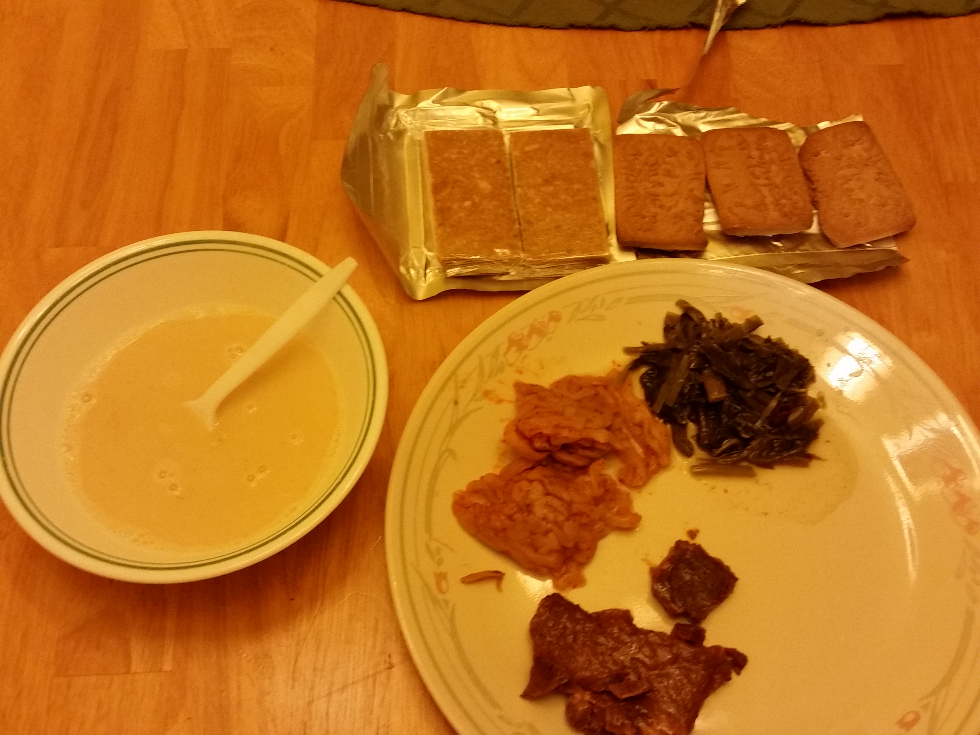 It contained tiny bite of wet packed beef jerkey, 3 cookies, 2 cereal bars, 2 types of pickled vegis, oatmeal, 2 bites of chocolate and 2 pieces of gum. The jerkey was alright. The cookies and cereal bars were good, not sweet at all. I am unfamiliar with what the picked vegis were, one was spicy cabage like and the other was leafy and tasted close to regular american pickles. The green leaf mush looked unappealing, however I enjoyed the flavor. Unfortunatley I ruined the oatmeal by adding too much water. The oats were finely ground with only a few bigger oats visable, it was good again not sweet. The chocolates were just plain ole dark chocolate. Over all I enjoyed this ration, however for what you get these things are way overpriced.