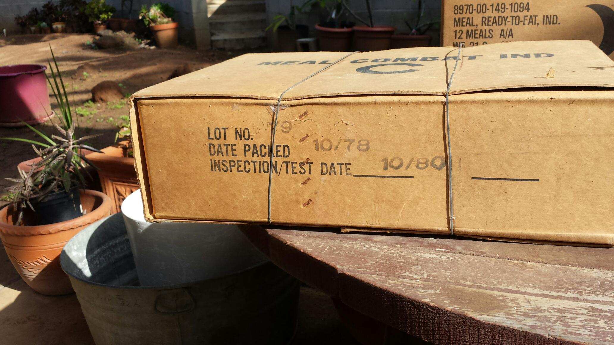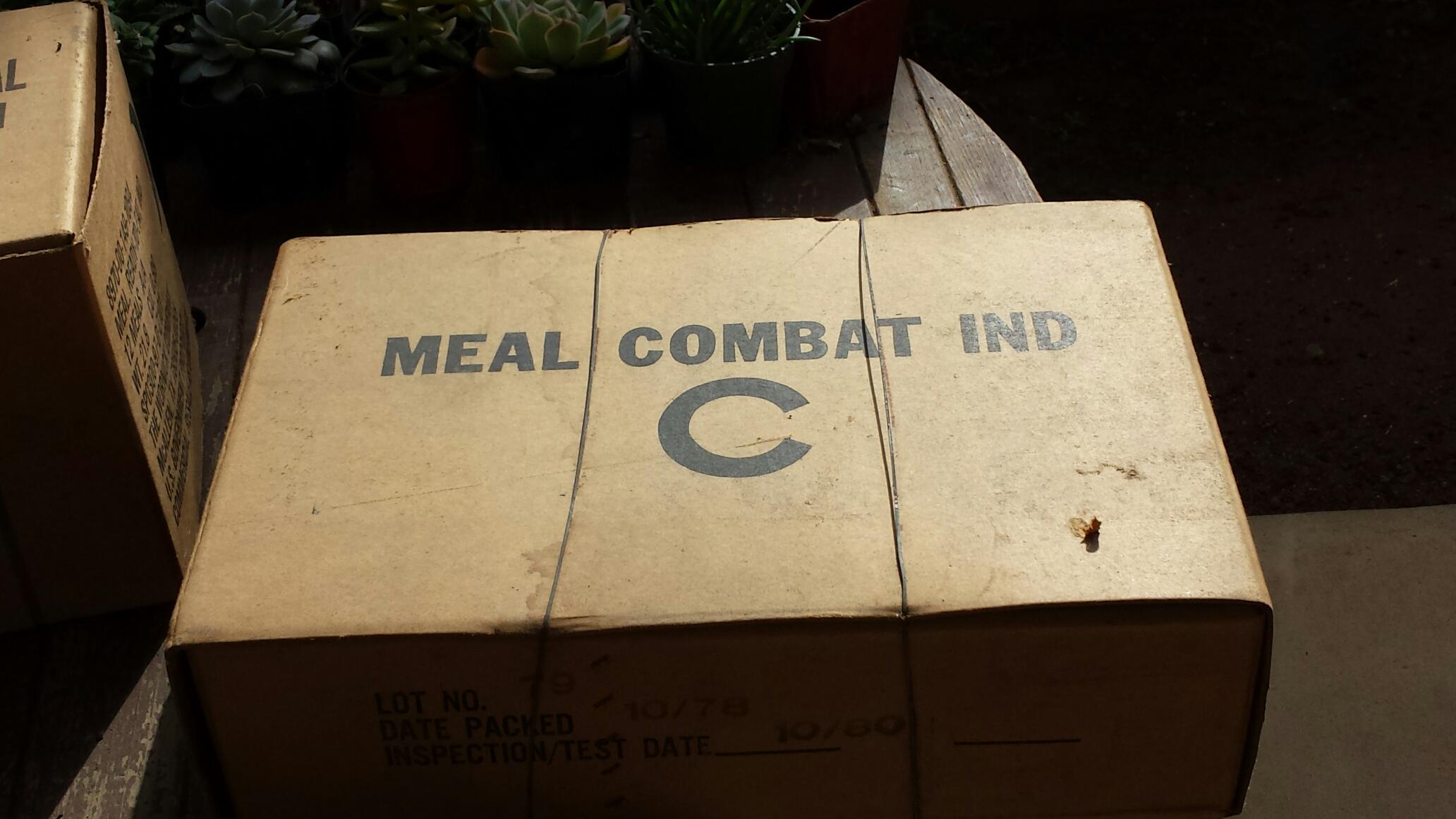 1 case of MCI rations, excellent condition. Wire wrap still on case. Case lot # is 79, date packed 10/78, inspection test date 10/80. Menu C. Ser # 8970-00-577-4513. DLA 13H-78-C-0907. Southern Packaging and Storage Co. Mullins SC 29574.