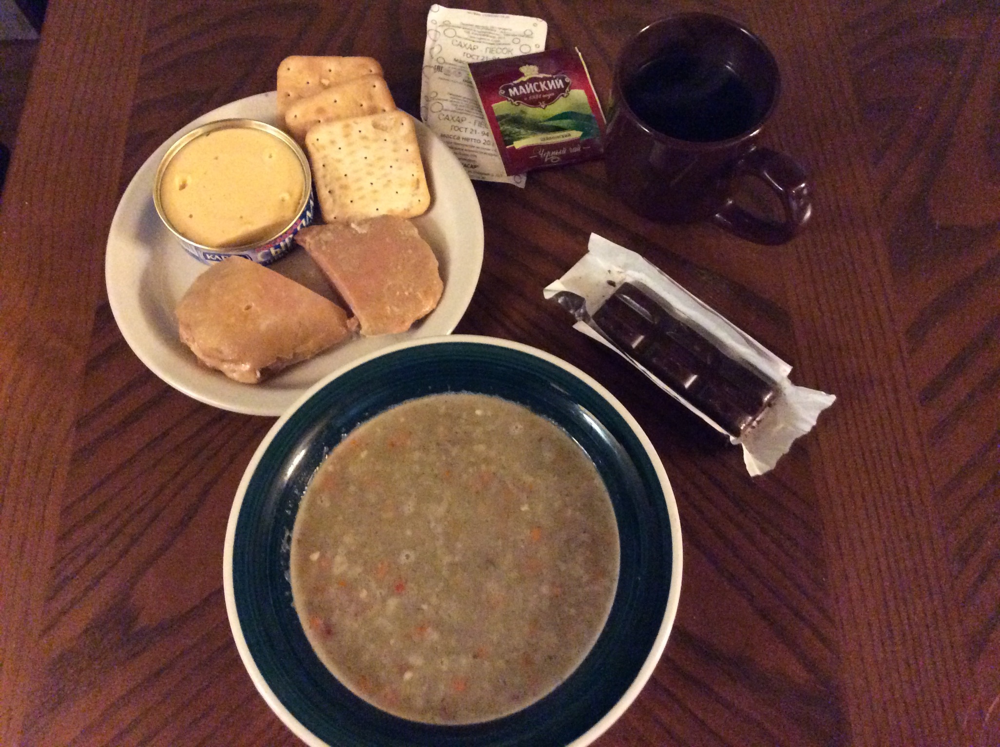Meal 3 consisted of beef barley soup, beef/pork sausage, cheese and crackers, tea with sugar, and a chocolate bar. Another huge meal. The beef barley soup was freeze dried and very good. Small bits of real beef with barley, oats and carrots in a broth with a hint of dill. The sausage tasted like Vienna sausage and went nicely with the cheese and crackers. The tea was a nice strong black tea and there's plenty of sugar. Chocolate bar for dessert.