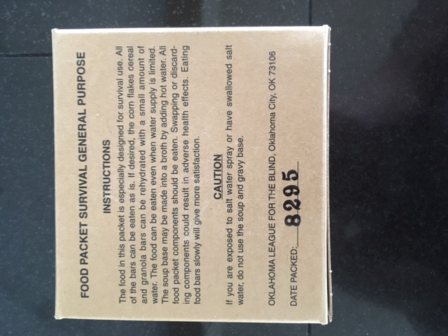 I found some of these one day, while inspecting our survival gear. They are USAF issue and I guess we used to pack them in survival containers before switching to Datrex food bars a few years ago. They are dated 1995, but I had one and they are still good. It comes with 1 packet of wintergreen tablets, 1 bullion broth, 1 tea, 2 shortbread bars, a corn flake cereal bar, a granola bar, and a chocolate bar. Not sure if anyone else has seen these before... I retired with 21 years in the service and this was the only time I have ever come across them, or even seen them before or since.