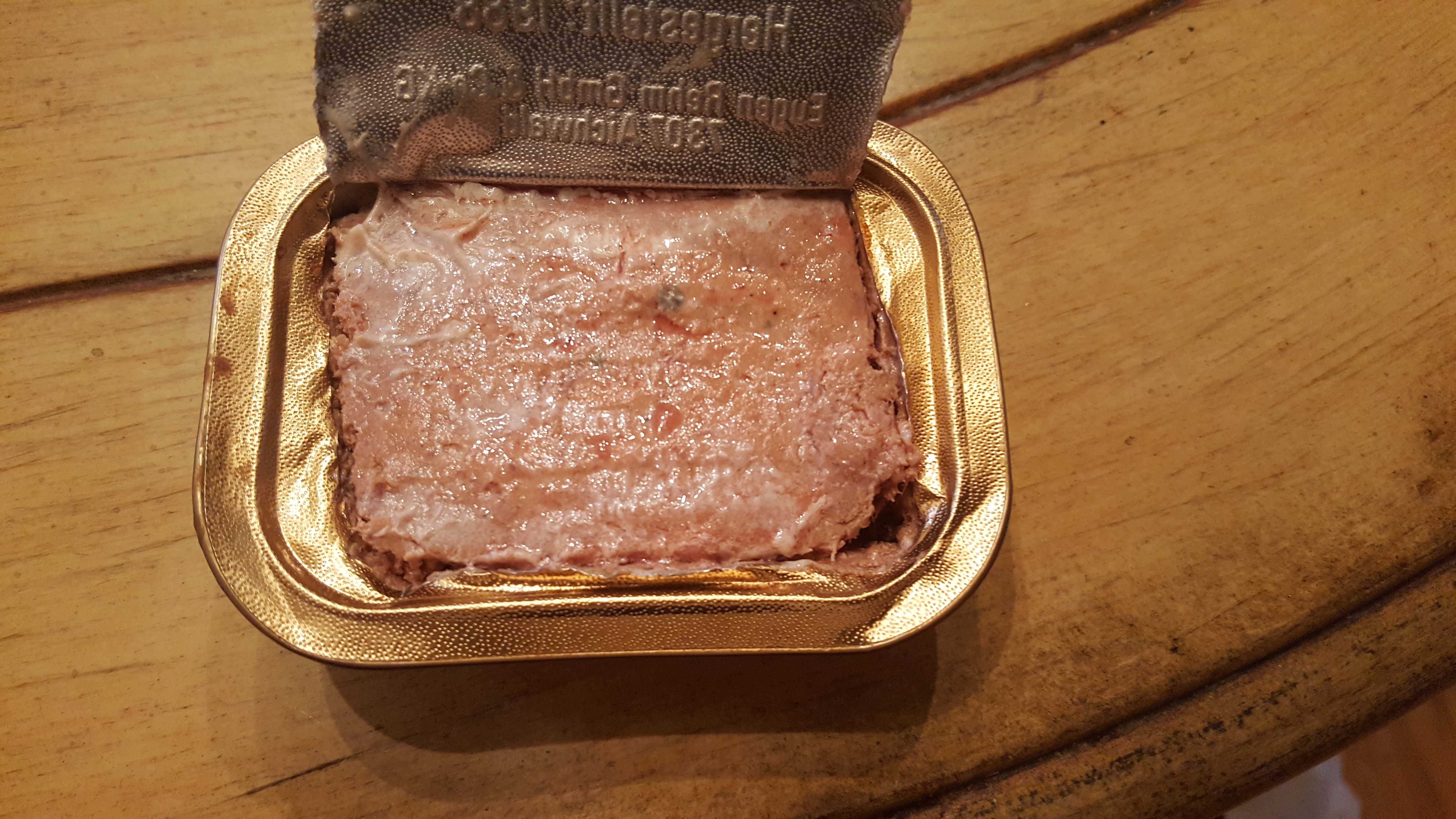 I'm not a big fan of pork so I was pretty scared to do so much as open the liverwurst, but I did anyway. It didn't look too good and didn't smell like much. It even appeared to have mold growing from it. Let's try the headcheese. I've never had headcheese and the very name scares me a bit. It turned out to be very watery and had a strong vinegar-like smell. I had to toss it.