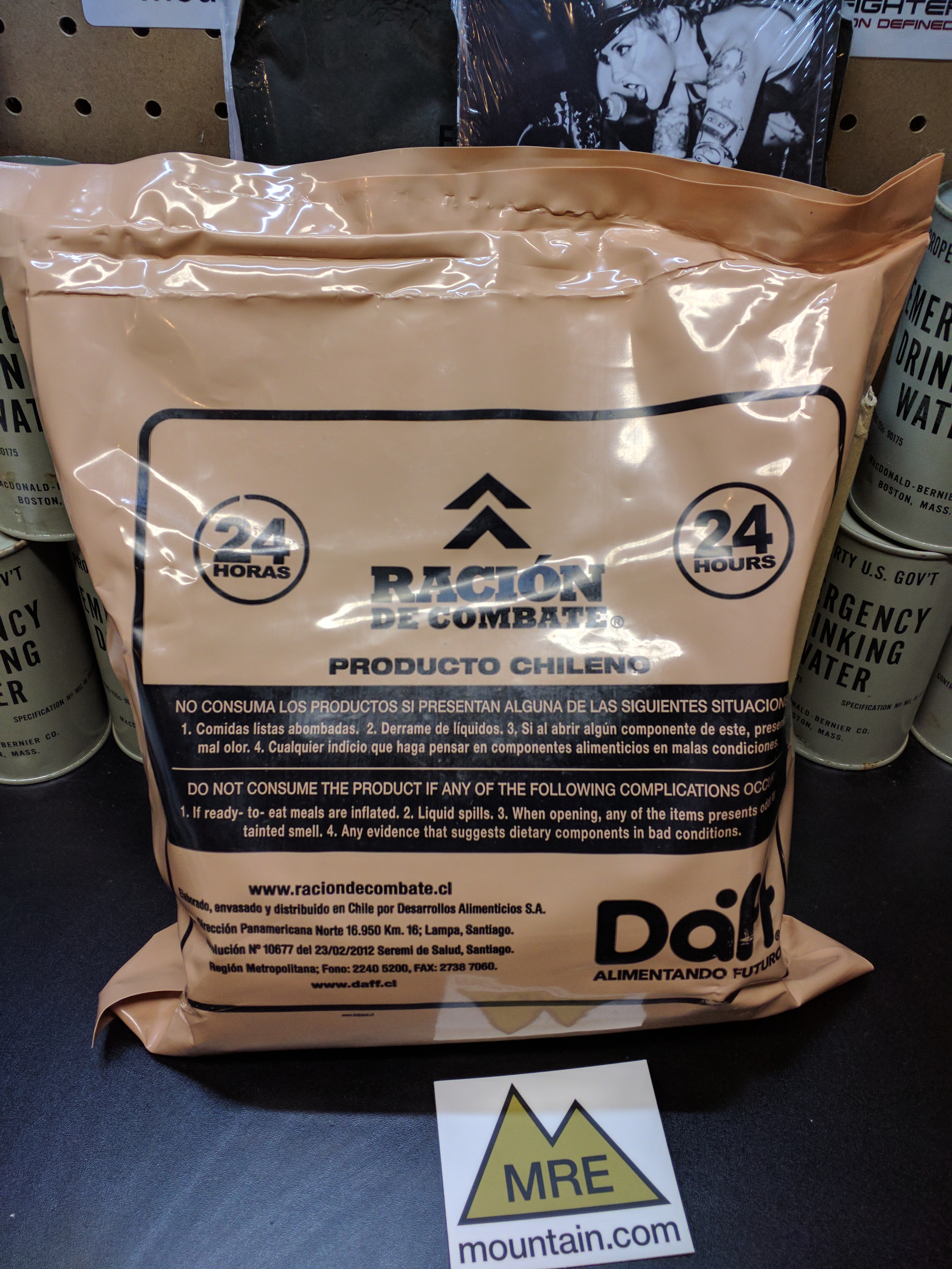 Items common to all menus: Granola cereal, Berry Cookies 80gr, (2) Isotonic Drink Mix, Peanuts with Raisins 70gr, (2) accessory packets [tea, coffee, (2) salt, (4) sugar, long handled spoon, (2) napkins], Daff Spork, (4) Flameless Ration Heaters.
