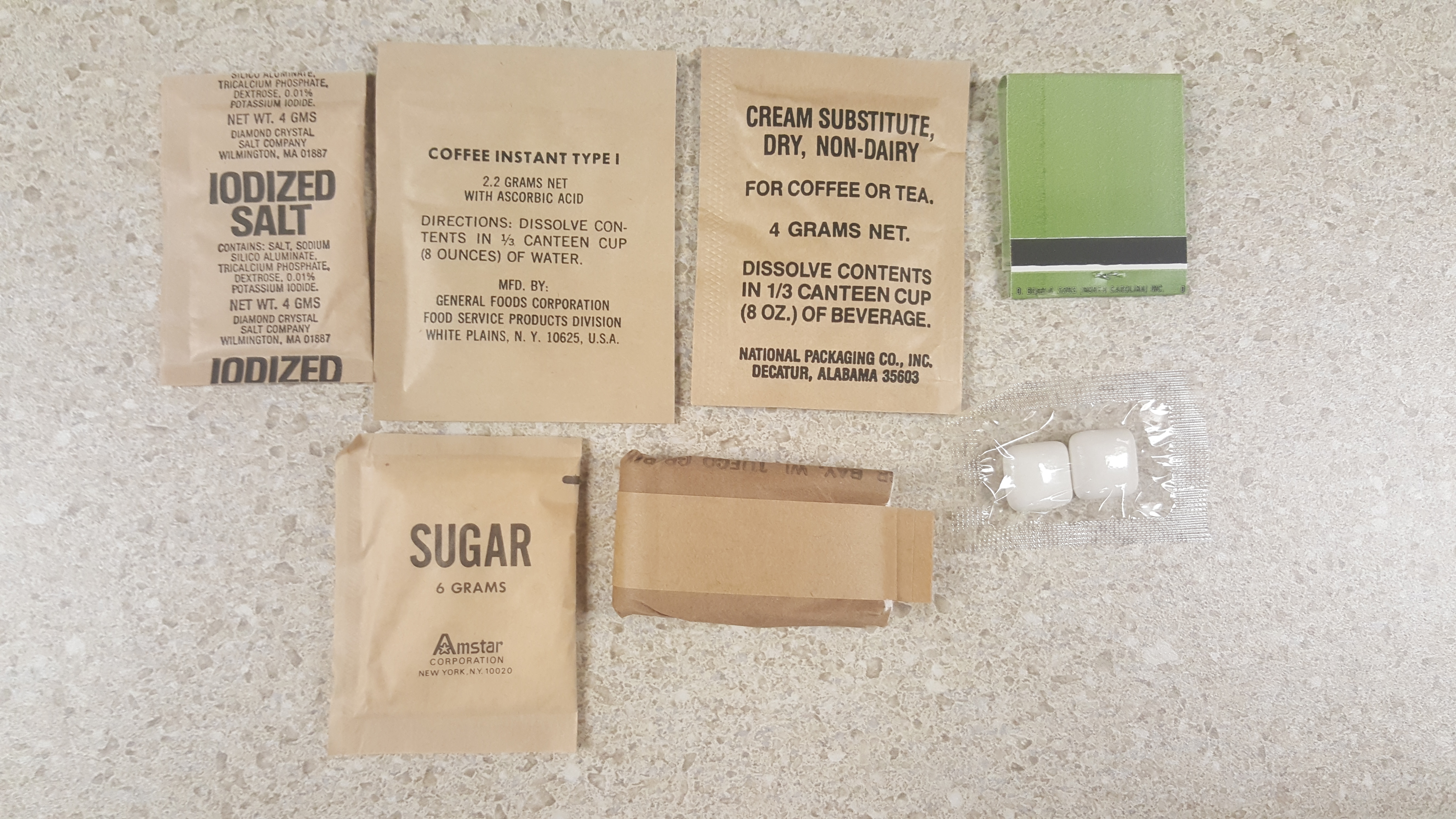The Type I coffee was still drinkable, as always. The sugar and creamer were also fine and brought the coffee to life. And that leaves us with the lemon-lime drink. At first, it had an odd flavor but I think it was alright. It was still powdered but it looked like the sugar or something had begun to separate. But I drank it nonetheless and I was pretty happy with it.