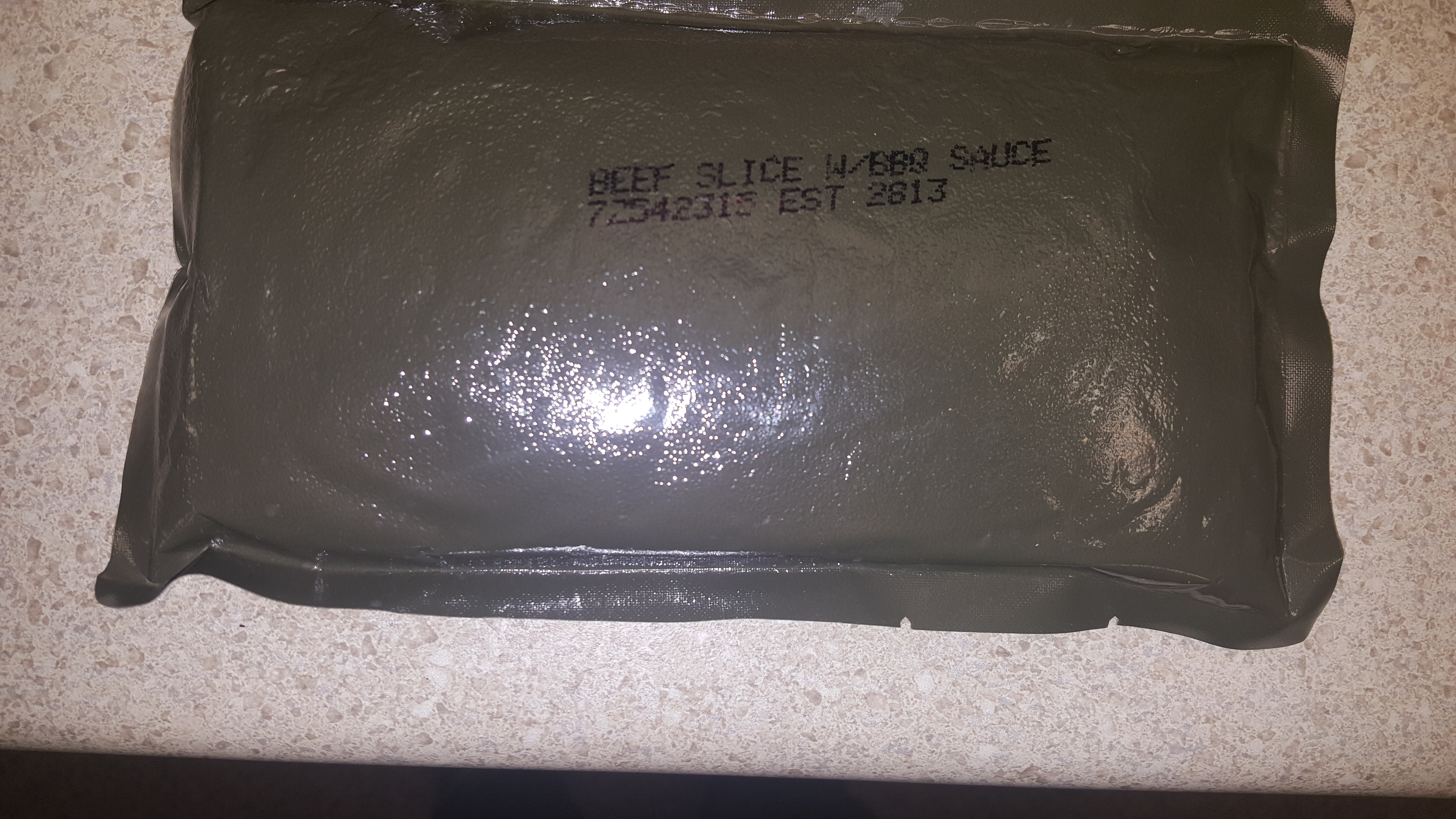 Closeup of the Beef Slices with Barbecue Sauce: Closeup of the cookie bar, peaches, crackers and unopened cheese spread: The result!: Alright, I don't know why they pluralized the name of this MRE. As you can see, there is only one beef slice. Anyway, it tasted pretty good! The texture was reminiscent of roast beef, but perhaps a lot harder. Having a fork/steak knife would have been helpful. The sauce was the highlight of this meal, it was mildly spicy and had a nice brown sugar/molasses taste to it. They should bring this MRE back, something tells me that it would do quite well.