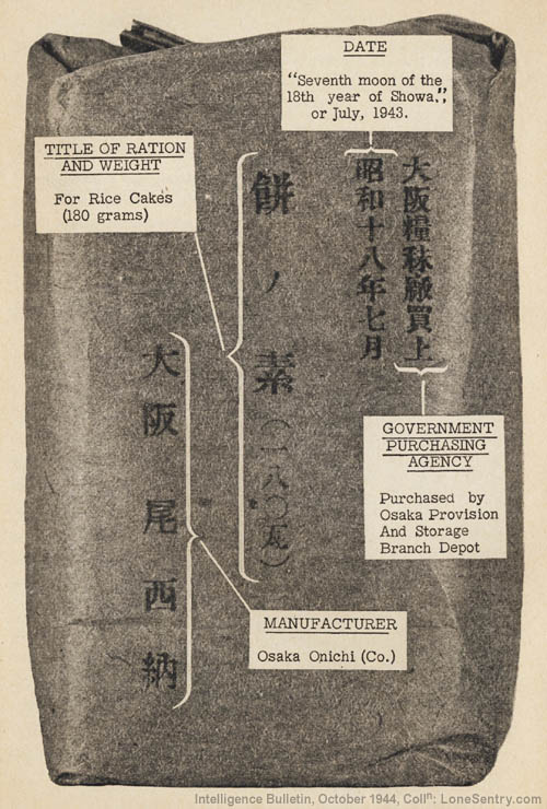 However, with long supply lines under constant attack by US aircraft & submarines, the ration in the field was far less - usually about a cup and a half of dry, uncooked rice, about 4-5 ounces of canned or dried meat or fish, and whatever vegetables were available locally.