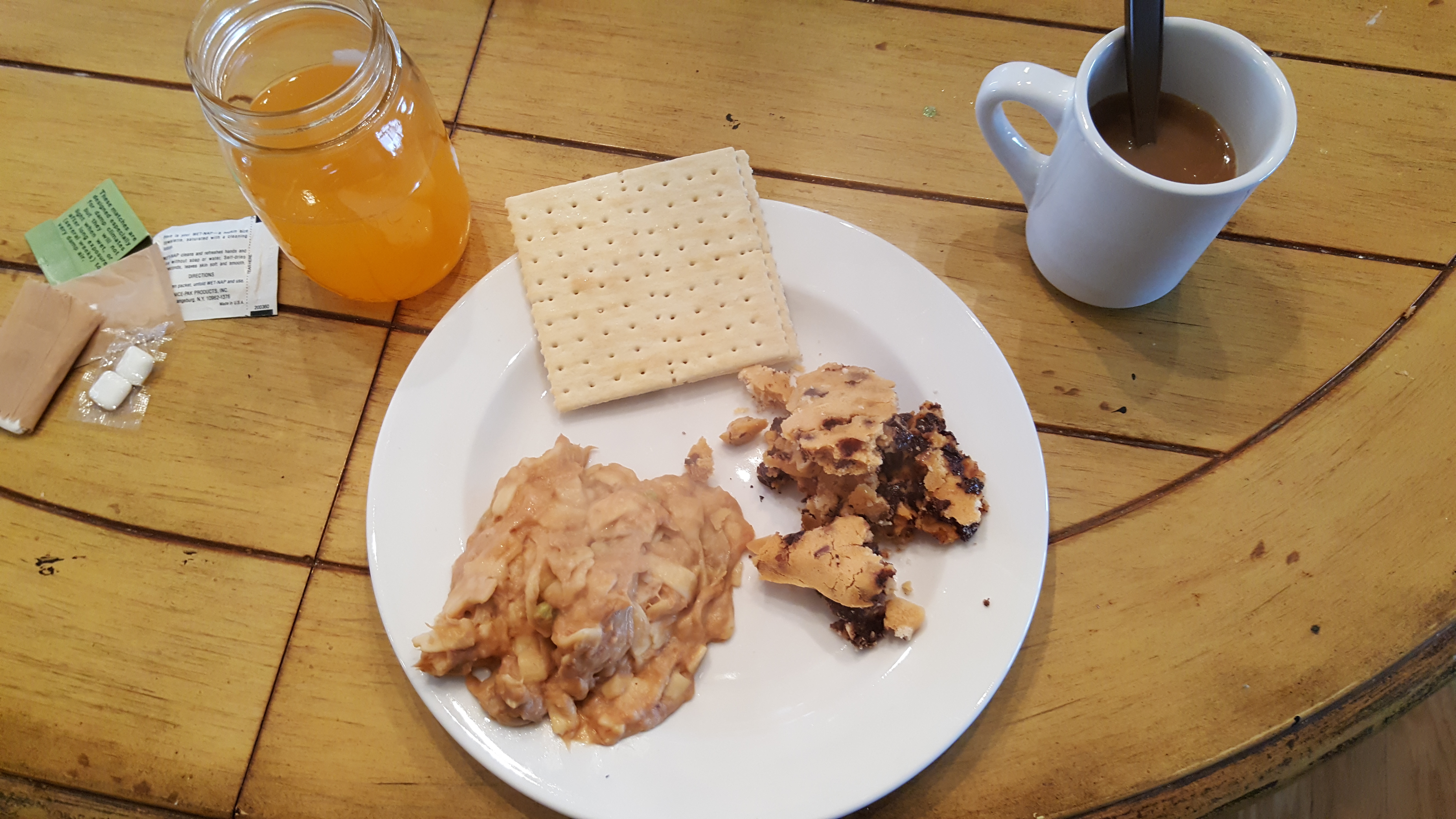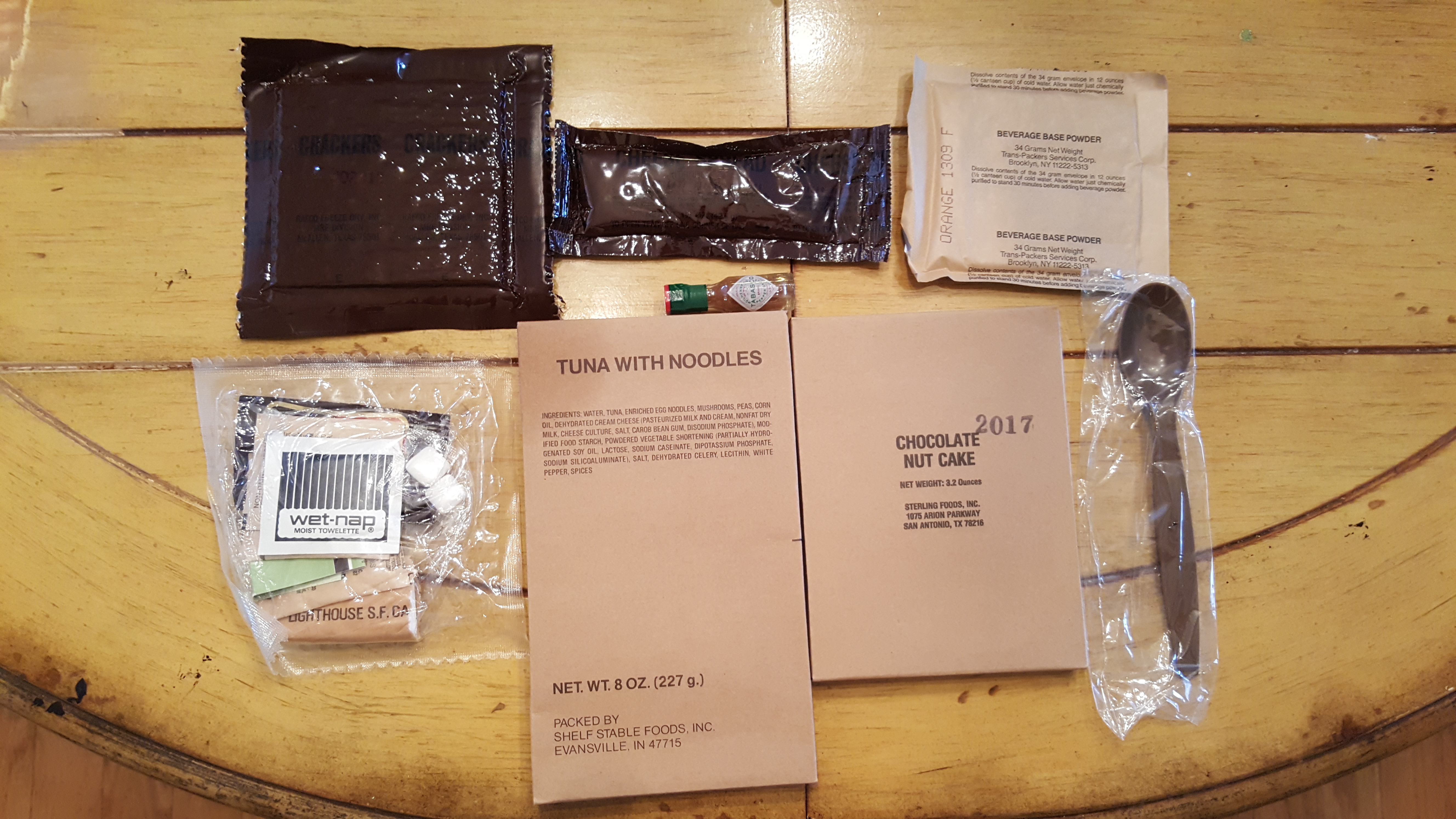 While that was going, I decided to get the coffee and orange drink together: And for those who are curious about the retort pouches looked like: The meal in almost its entirety: Well, despite my luck with this meal last time, this one didn't last. It smelled off when I opened the pouch and it tasted okay when I took my first bite but then that nasty sour taste coated my mouth. Pass. While I have no way to prove it, I remain certain that the cake would have still broken up into pieces if I hadn't boiled it in hot water. I've had a few of these old MRE cakes break into pieces upon getting them out of the retort pouch. It still tasted great, though. The crackers were, well, they're just like any ol' crackers you'd expect in an MRE. Unfortunately, they're not the really good crackers that MREs had in the 1980s. The cheese spread did not make it. It was very odd and discolored when I poured it out. I have a picture of it but in an attempt to keep those with a weak stomach from becoming disappointed in me, I decided not to include it in this review.