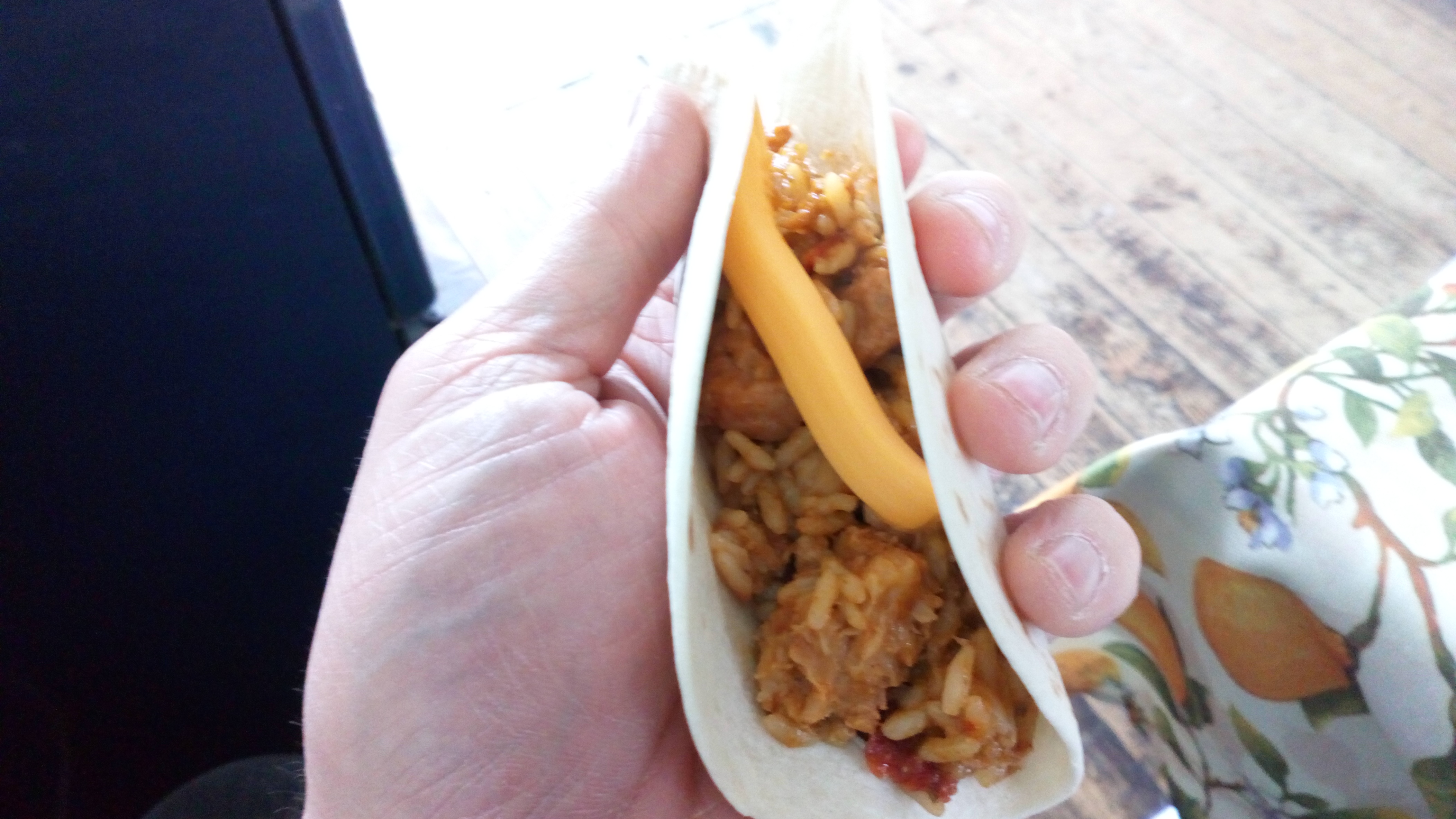 I'm in my house so I heated up the main in a bowl in the microwave for one minute, kneaded the cheese spread and then took the tortilla packet out of my jeans pocket where it had been warming up slightly for about 20 minutes.