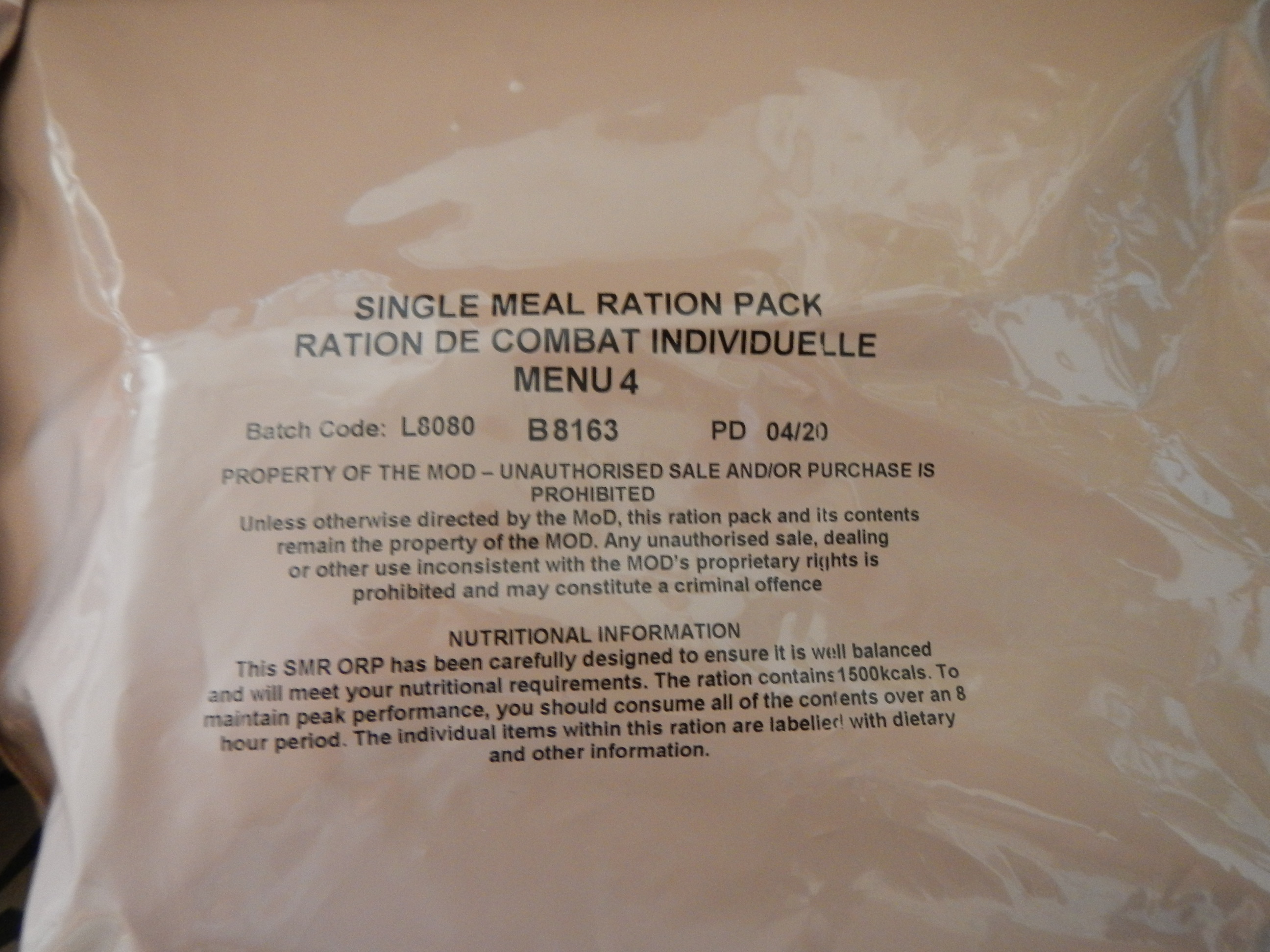 https://pdfsecret.com/download/operatio ... 8fd3a9_pdfc. Single Meal Ration (SMR). This is a light-weight ration designed specifically for sustainment over a specific period. It is issued with a Flameless Ration Heater (FRH) dispensing with the requirement for an additional heating source. Contents include a main meal pouch, a range of snack items and both isotonic drink and hot beverage powders but no matches. The SMR provides a minimum of 1400 kcal per ration, supplied in 10 menu variants, including one vegetarian, mixed per box.