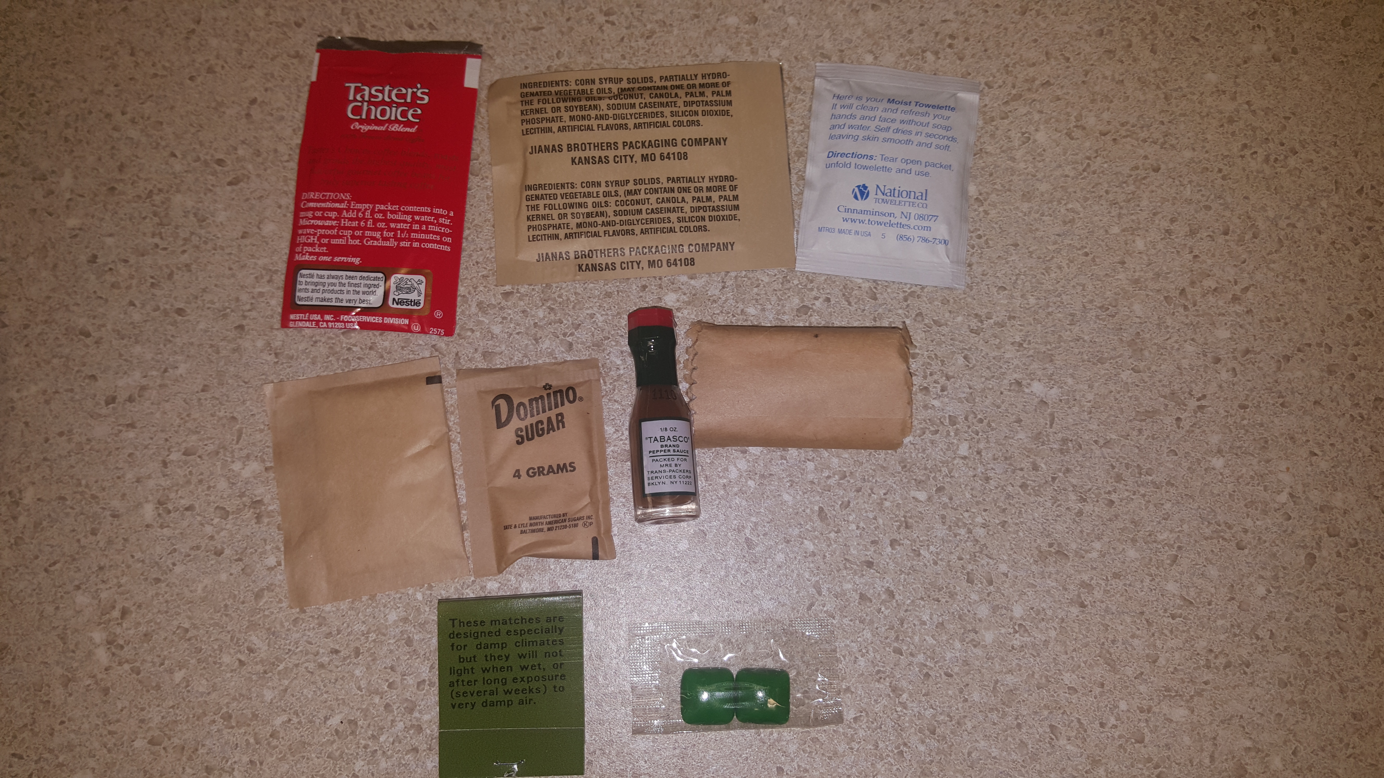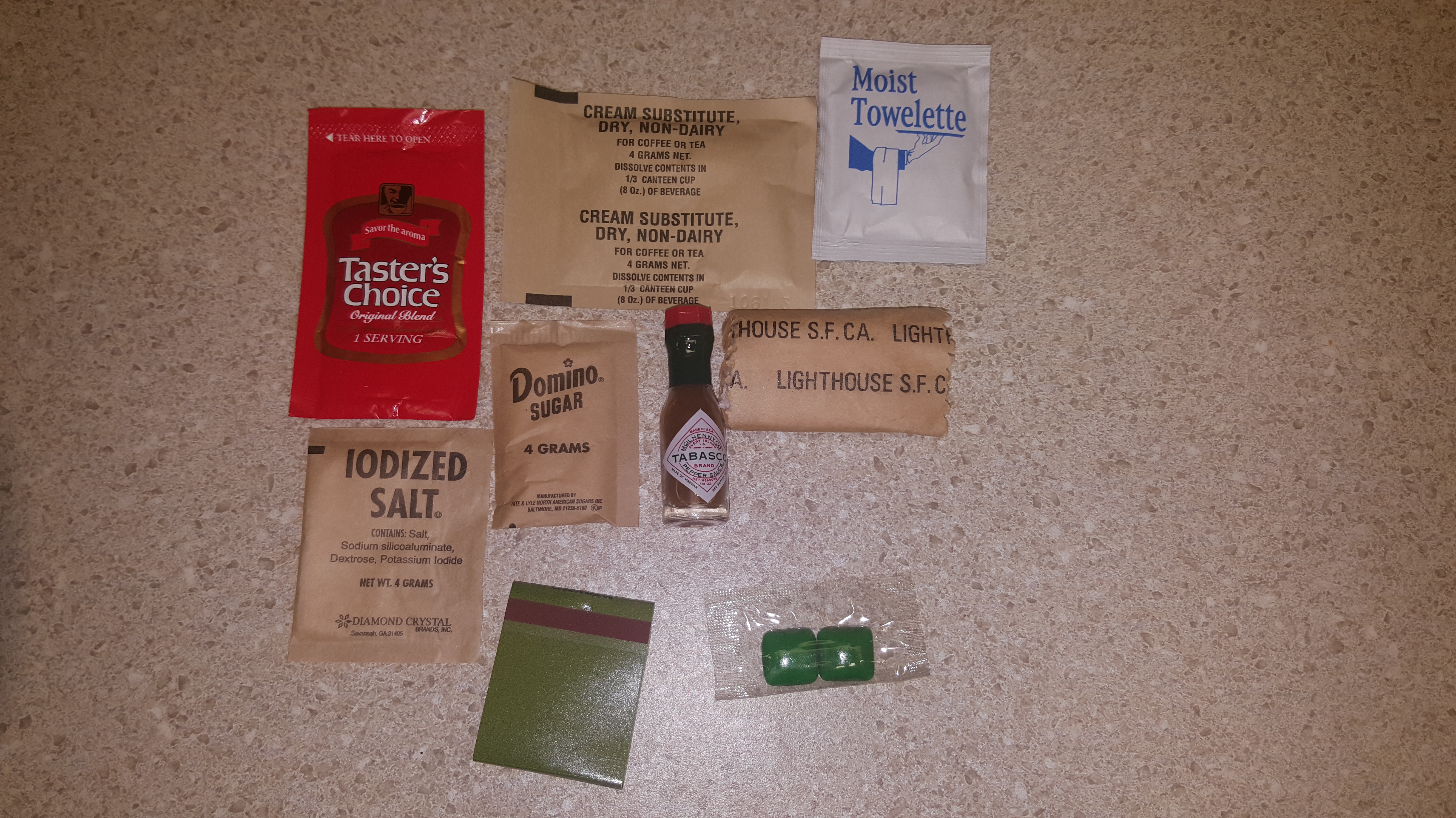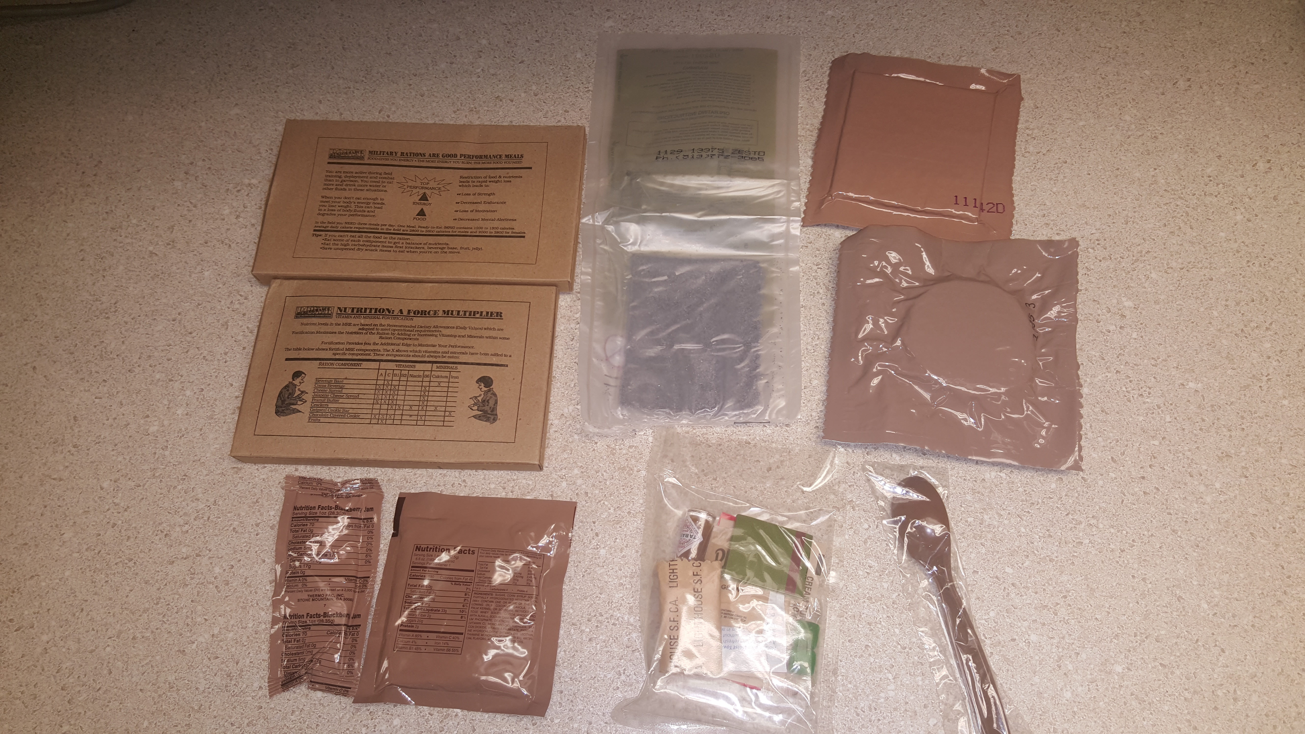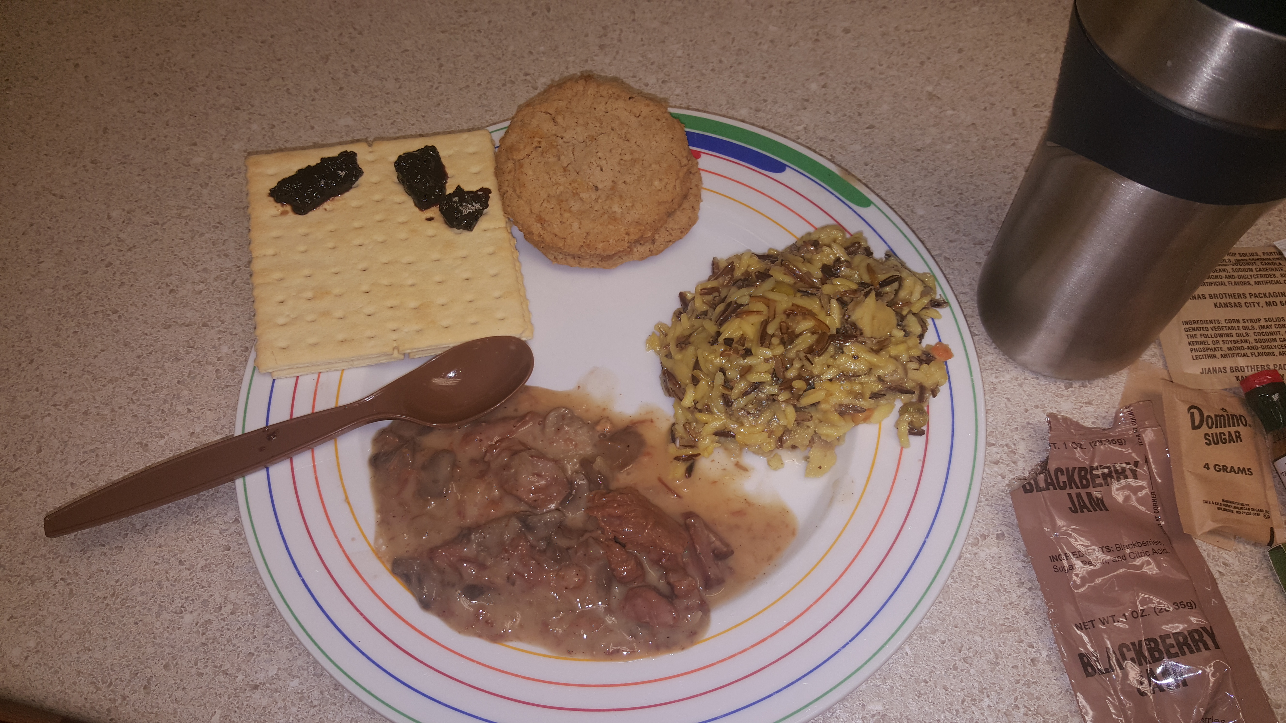 This one had some good items in it, but overall it was nothing too terribly exciting. The main was a bit sour and I could tell it was starting to go bad, so I didn't finish it. The smell was similar to mushroom soup. Nothing about how it smelled or the way it looked suggested that it was spoiled. The rice was pretty tasty! It was perfectly chewy, seasoned and even had bits of green peas in it! The crackers identical to the same MRE crackers you'd find in a current MRE, and they tasted fine as usual. I love blackberry jam, so naturally I was happy with that. The oatmeal cookies were also perfectly tasty. One oddity is that they gave you two smaller cookies as opposed to one large one like they do today. The amount of calories has remained about the same. I had to use my coffee cup for the cocoa hence why I had to take a separate photo to show it.