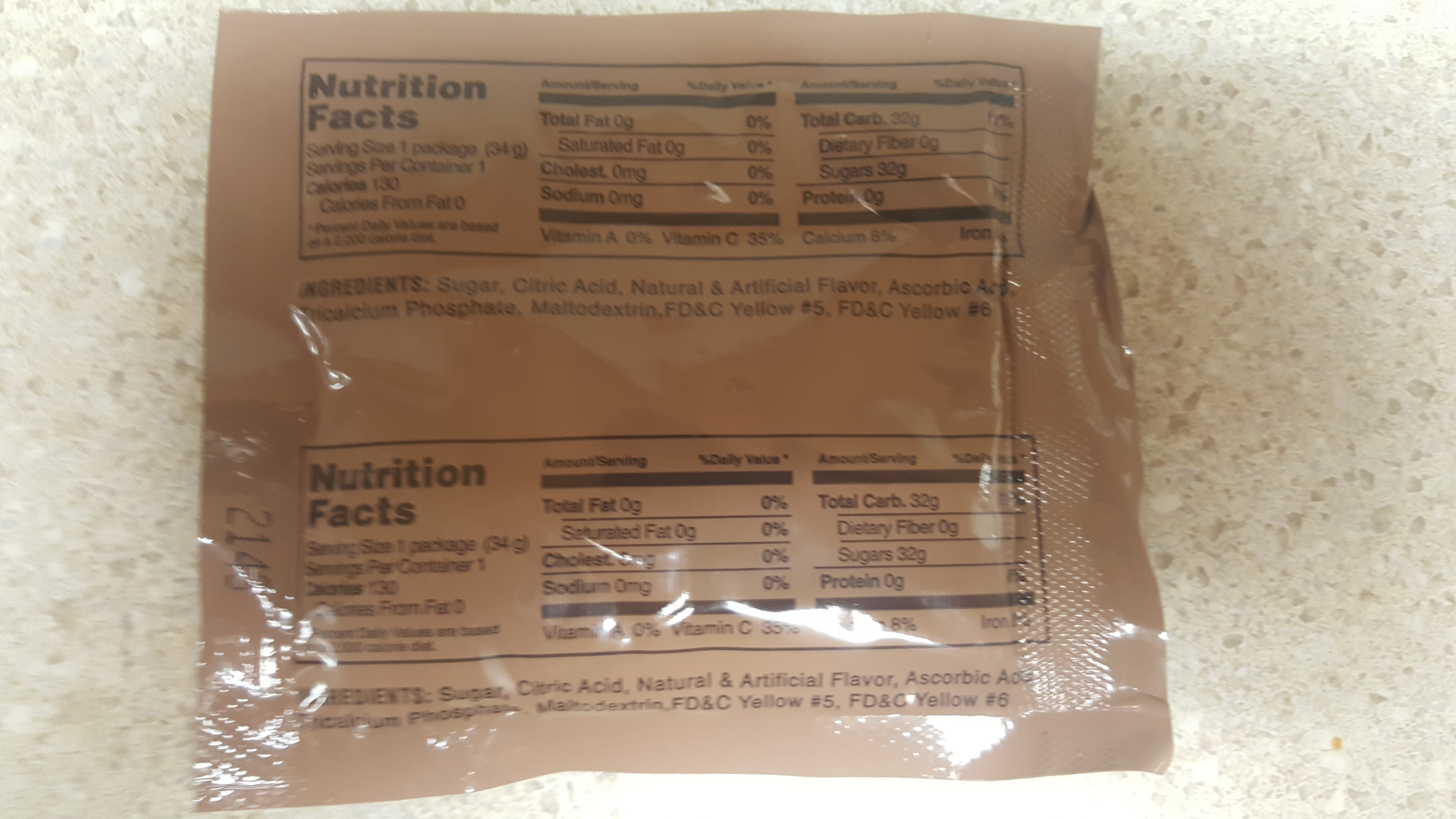 I was a little concerned about the cheese spread. I've had some from MREs as new as 2012 that had bad cheese spread, so naturally I expected less than desirable results from this ration. While it did look a little off in color, it smelled okay and it even tasted okay. It went nicely with the vegetable crackers. The cookies were also pretty tasty, although the packaging has changed since 2002. Nowadays, they give you one big cookie opposed to two smaller cookies like this MRE had. Personally, I like the way they did it in this ration. The orange drink mixed nicely and was a great addition to this MRE.